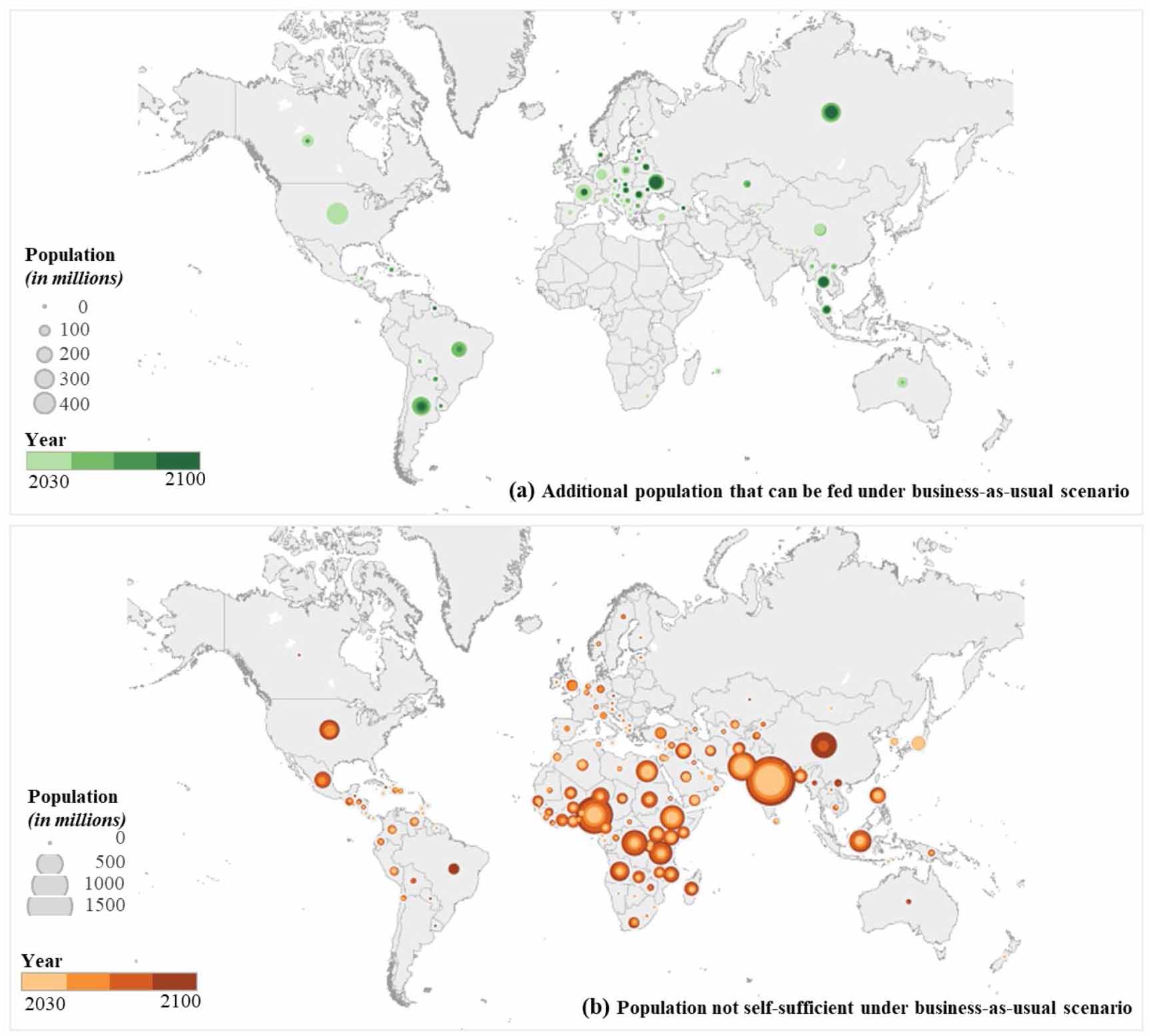 Figure 5. Excess population that can be fed (a) and population for which caloric demand will not be met (b) (in millions of people) from years 2030 to 2100 under business-as-usual scenario. (a) country-specific additional population that could be fed under sustainable yield gap closure based on excess crop production. (b) population whose food demand will not be met through domestic food production in each country. Population (in millions) is represented by the varying bubble sizes. The years are represented by the respective color scales with the lightest shade for year 2030 and the darkest shade for 2100. If a country has a deficit in one year and excess another, it will appear on both panels. This figure represents the business-as-usual scenario.