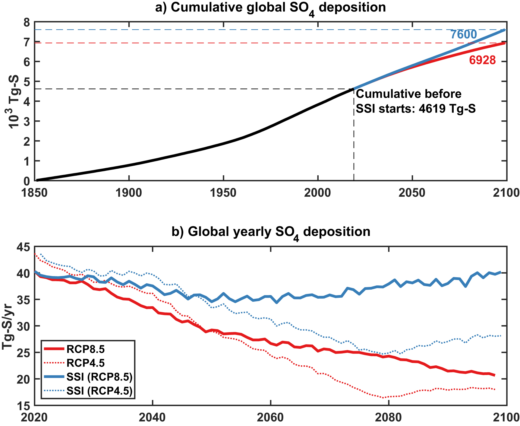 Figure 1. (a) Cumulated global deposition of SO4 (expressed in Tg-S) from 1850 (black line) until 2010, and for RCP8.5 (red line) and SSI (blue line, starting in 2020). (b) Yearly and globally averaged SO4 deposition (in Tg-S yr−1) in RCP8.5 (red) and RCP8.5 + SSI (blue) for the total deposition. Dotted lines of the same color show the same quantities scaled for an RCP4.5 scenario without and with SSI.