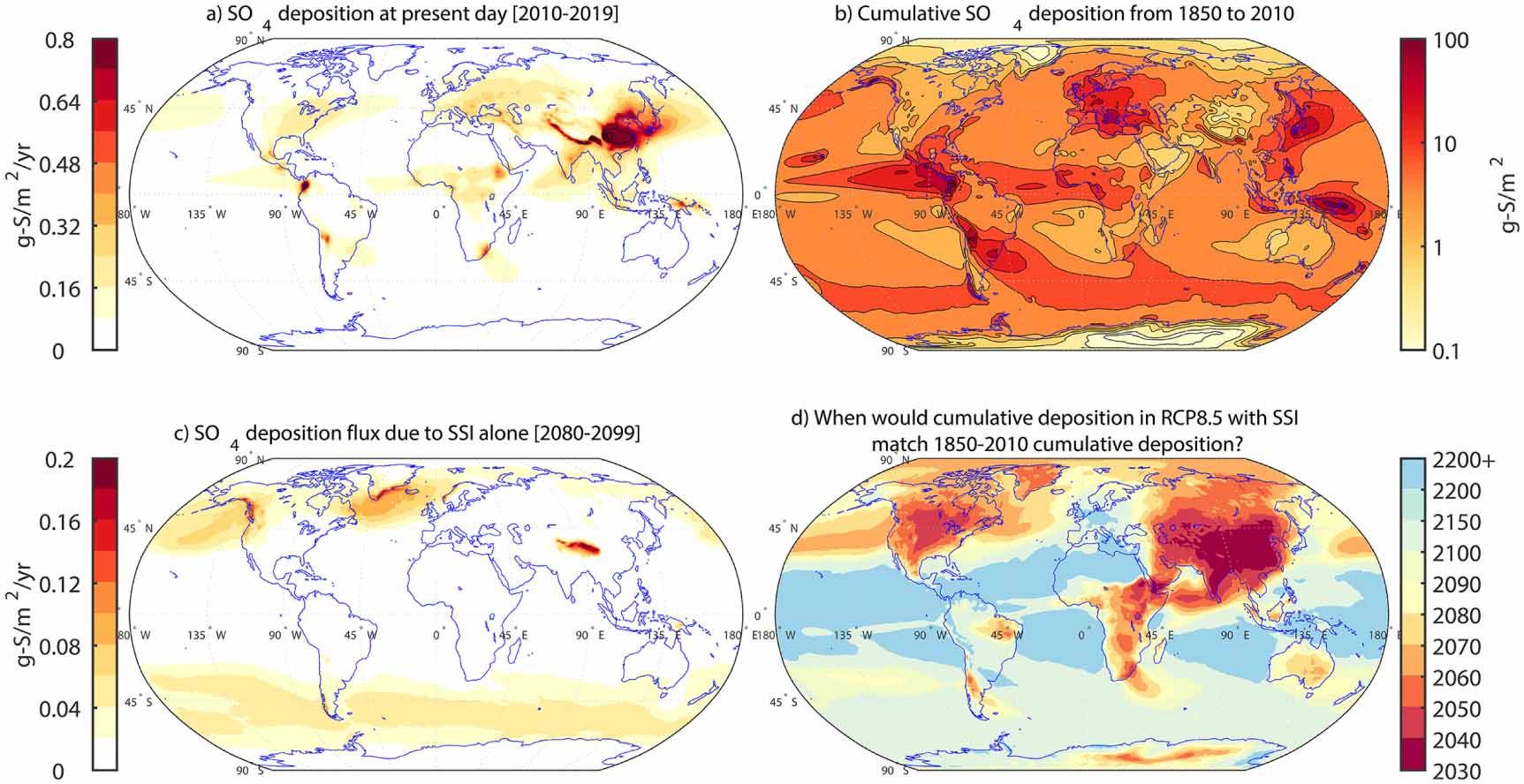 Figure 2. (a) Geographical distribution of SO4 deposition fluxes (g-S m−2 yr−1) for 2010–2020. (b) Cumulated SO4 deposition from 1850–2010 on a logarithmic scale (g-S m−2) (c) differences in 2080–2099 deposition between the SSI scenario and RCP8.5 (g-S m−2 yr−1). (d) Years needed in this SSI scenario to match the cumulative deposition in the historical period. For years greater than 2100, an emulator has been used to estimate the increase in temperatures and the sulfate needed (see methods).