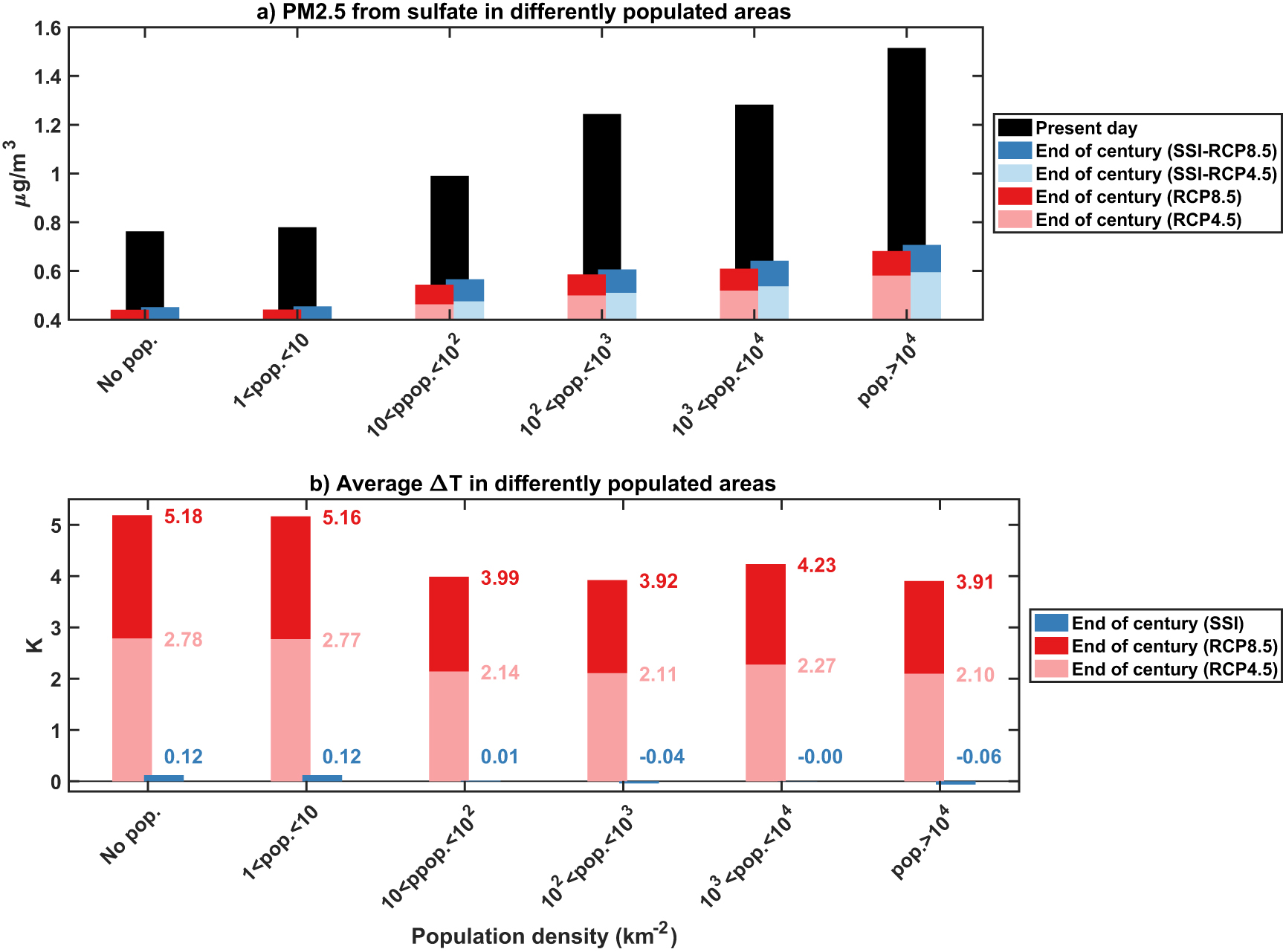 Figure 3. (a) PM2.5 (μg m−3) from sulfate concentration averaged over areas with similar population density. (b) Same as a), but with averaged temperature changes (K) compared to present day. Projected population data taken from the SSP5 scenario, 2020 for present day and 2090 for end of century.