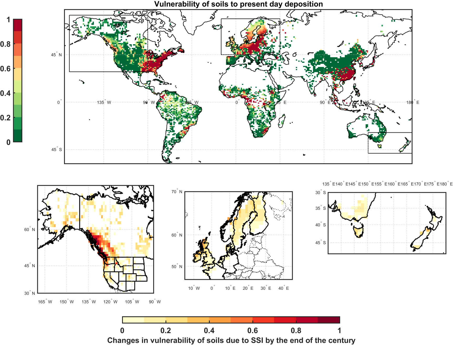 Figure 4. Evaluated vulnerability of different soils to the present-day deposition (top panel) and increase in vulnerability under the geoengineering scenario (bottom panels, calculated as the difference in vulnerability between SSI in 2080–2100 minus present day, see also figure S4). Vulnerability is here defined as the potential of soils to release Al in the process of neutralizing incoming acidity (as shown, for instance, in [26, 27], Al is a toxic chemical for many terrestrial and aquatic ecosystems), and is calculated as the product of the aluminum saturation percentage inferred from present-day soil pH (figure S2) and the S deposition fluxes shown in figure 2, divided by its global maximum so that the index ranged between zero and 1.