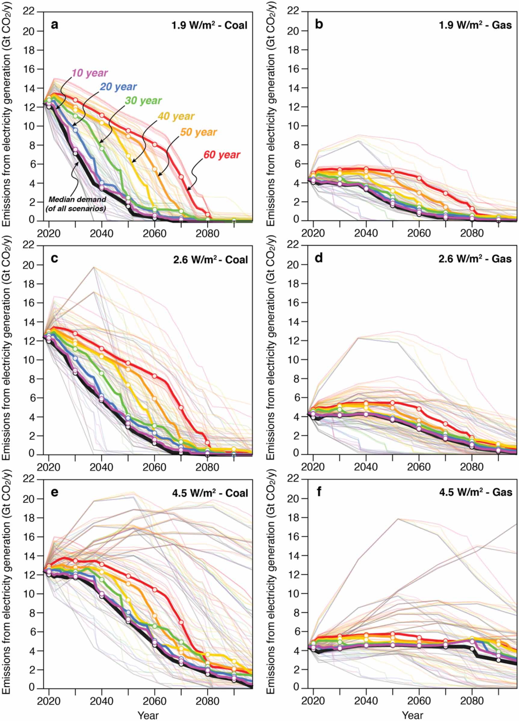 Repeated analyses vary the assumed lifetimes of coal- and gas-fired power plants 10–60 years and capacity factors from 35%–75%, applicable to both existing generators and any infrastructure commissioned in the future. In our standardized approach, power generators are phased out once their expected operational lifetime has elapsed. New power generators are only built if the annual power supply dips below annual power demand, which can occur when existing power infrastructure is retired or if there is a sustained increase in power demand projected by the IAMs. Newly constructed generators are assumed to have the same operating conditions as the corresponding model run. Nonetheless, we calculate the 1.9 and 2.6 W m−2 radiative forcing scenarios required very little deployment of new coal-fired power plants, instead most of the overshoot observed in our results come from existing power infrastructure with the exemptions of a few regions globally.