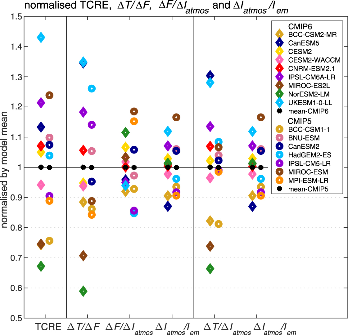 Figure 10. Intermodel normalised spread for the TCRE and its components for 9 CMIP6 (diamonds) and 7 CMIP5 models (circles) over years 120 to 140 including the thermal response from the dependence of surface warming on radiative forcing, ΔT/ΔF, the radiative forcing dependence on the change in atmospheric carbon, ΔF/ΔIatmos, and the airborne fraction,