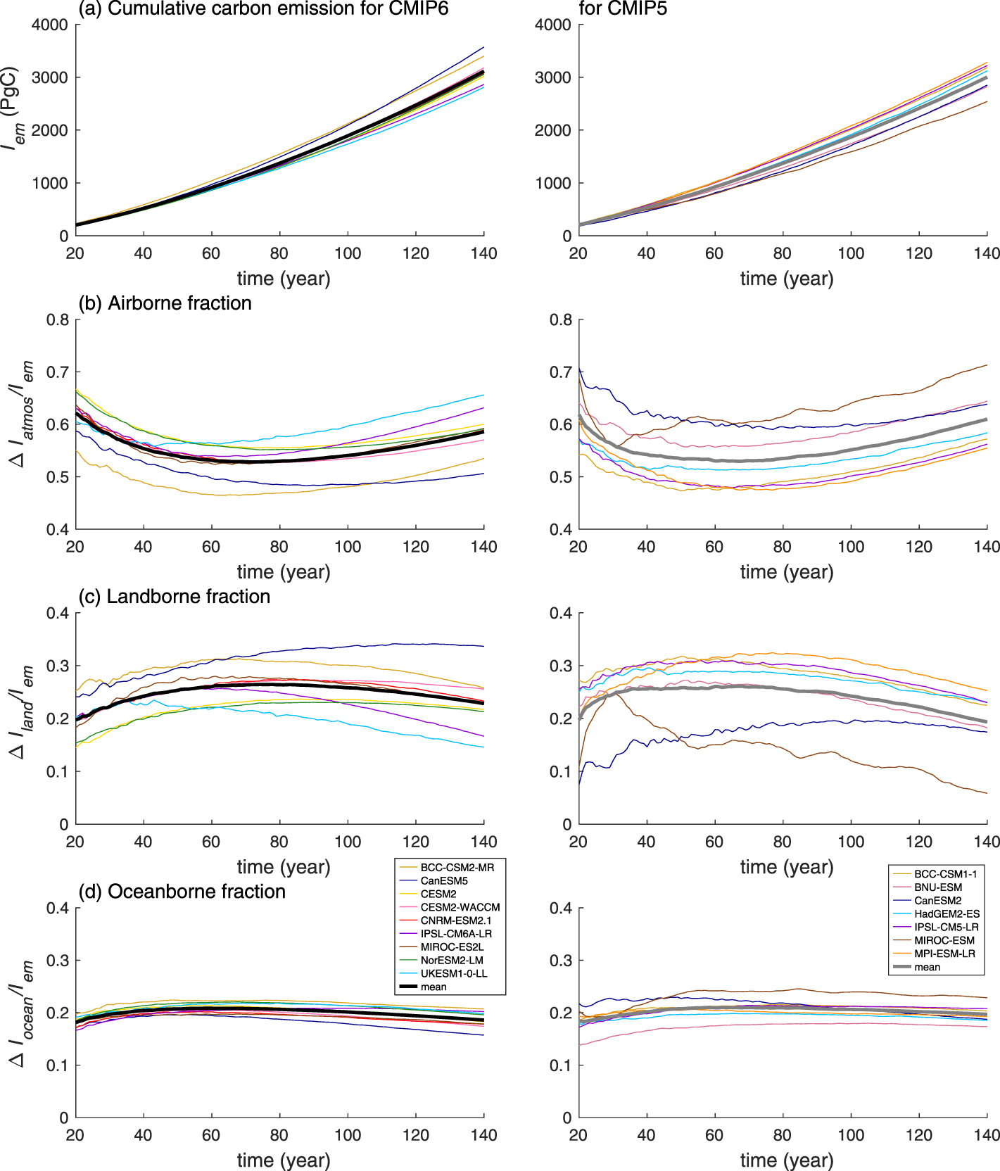 Figure 2. Evolution of the carbon budget over 140 years for 9 CMIP6 (left panels) and 7 CMIP5 (right panels) Earth system models together with their model mean (thick black and grey lines): (a) cumulative carbon emission, Iem in PgC; (b) airborne fraction,