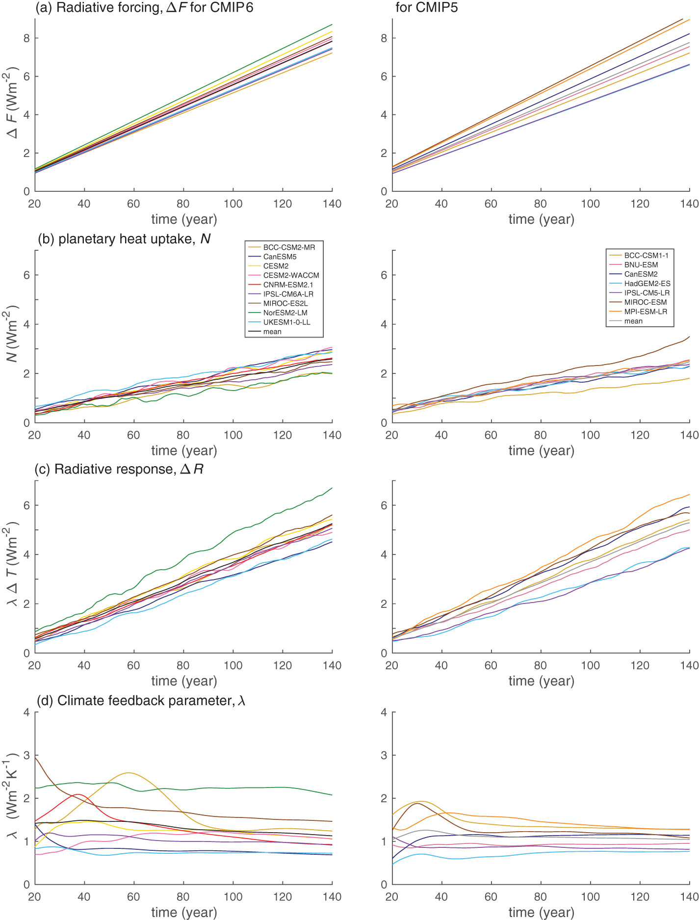 Figure 3. Evolution of the radiative and heat budget over 140 years for 9 CMIP6 (left panels) and 7 CMIP5 (right panels) Earth system models together with their model means (thick black and grey lines): (a) radiative forcing, ΔF in W m−2, which drives an increase in (b) planetary heat uptake, N in W m−2 and (c) a radiative response, ΔR in W m−2, together with (d) the climate feedback parameter, λ = ΔR/ΔT in W m−2K−1.