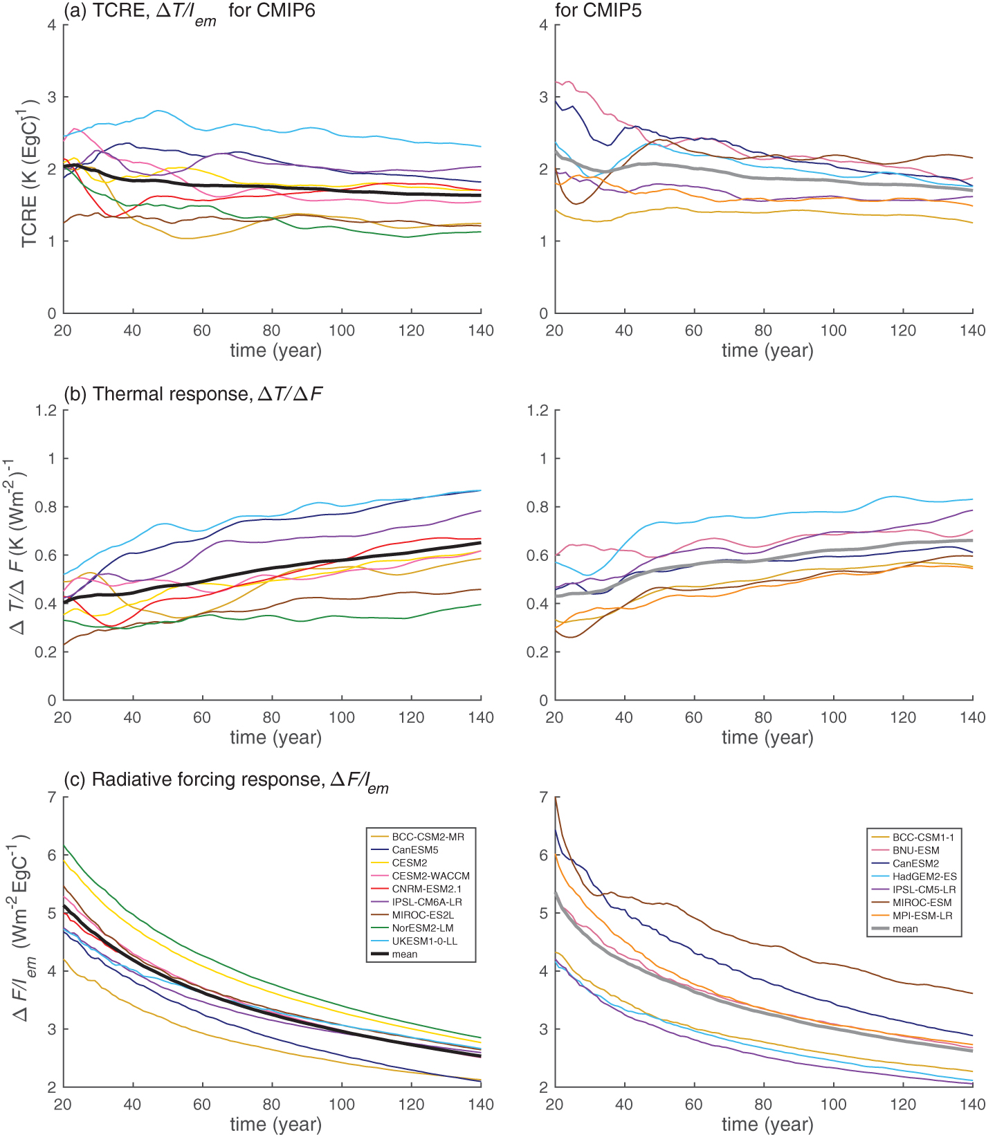 Figure 5. Evolution of the TCRE and its components for 9 CMIP6 (left panels) and 7 CMIP5 (right panels) Earth system models together with their model means (thick black and grey lines): (a) the TCRE from the dependence of surface warming on cumulative carbon emissions, ΔT/Iem in K EgC−1; (b) the thermal response from the dependence of surface warming on radiative forcing, ΔT/ΔF in K (W m−2)−1; and (c) the dependence of radiative forcing on cumulative carbon emissions, ΔF/Iem in (W m−2) EgC−1.