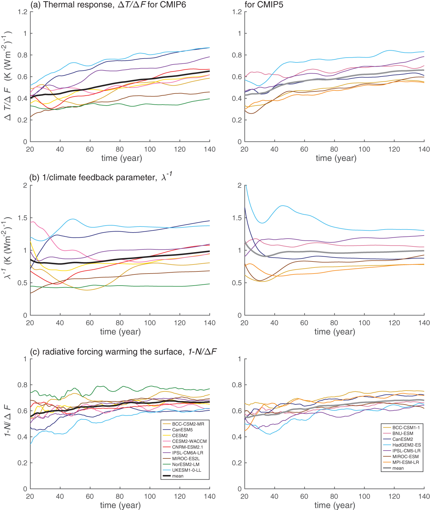 Figure 6. Evolution of (a) the thermal response from the dependence of surface warming on radiative forcing, ΔT/ΔF in K (W m−2)−1; (b) 1/climate feedback parameter, λ−1 in K (W m−2)−1; and (c) the fraction of radiative forcing that warms the surface, (1 − N/ΔF), for 9 CMIP6 (left panels) and 7 CMIP5 (right panels) Earth system models together with their model means (thick black and grey lines).