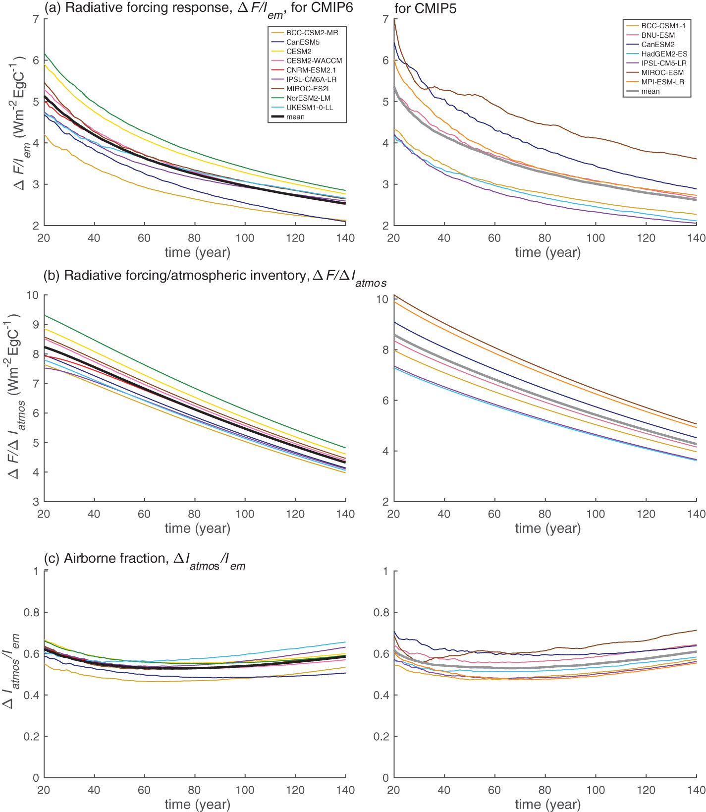 Standard image High-resolution imageThe weakening in the radiative forcing response given by the radiative forcing dependence on cumulative carbon emissions, ΔF/Iem (figure 7(a)), from (7) is mainly due to a weakening in the radiative forcing dependence on atmospheric carbon, ΔF/ΔIatmos, from a saturating effect (Myhre et al 1998) together with smaller contributions from the changes in the airborne fraction (Matthews et al 2009) (figure 7(b) and (c)). This response is also explained in terms of how far the ocean is from a carbon equilibrium with the atmosphere (Goodwin et al 2015, Williams et al 2017, Katavouta et al 2018). This radiative forcing response is similar in pattern for both the CMIP6 and CMIP5 models. There is though a smaller intermodel spread in both the radiative forcing dependence on atmospheric carbon and the changes in the airborne fraction responses for the 9 CMIP6 models relative to the 7 CMIP5 models (table 3).