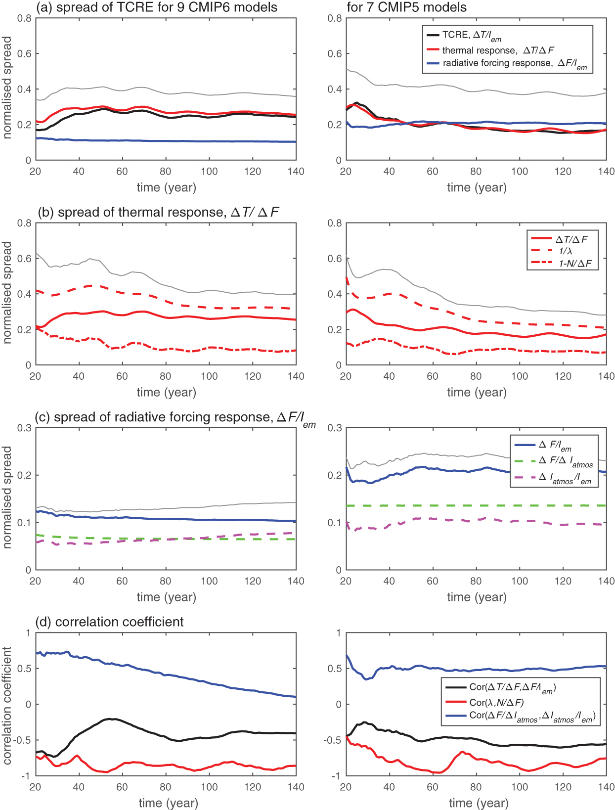 Figure 8. Evolution of the normalised spread of the TCRE and its components for 9 CMIP6 models (left column) and 7 CMIP5 models (right column), given by the coefficient of variation (from the intermodel standard deviation divided by the model mean): (a) the TCRE, ΔT/Iem (thick black line), and its components for the thermal response, ΔT/ΔF (red line) and the radiative forcing response, ΔF/Iem (blue line), together with the expected variation of the TCRE (grey line) if each of the contributions operate independently of each other; (b) the thermal response given by the dependence of surface warming on radiative forcing, ΔT/ΔF (red line), 1/climate feedback, λ−1 (dashed red line) and the fraction of the radiative forcing warming the ocean interior, ΔN/F (red dot-dash line) together with the expected variation of the ΔT/ΔF (grey line); and (c) the dependence of radiative forcing on cumulative carbon emissions, ΔF/Iem (blue line), the ratio of the radiative forcing and the change in the atmospheric carbon inventory, ΔF/ΔIatmos (green dashed line) and the airborne fraction,