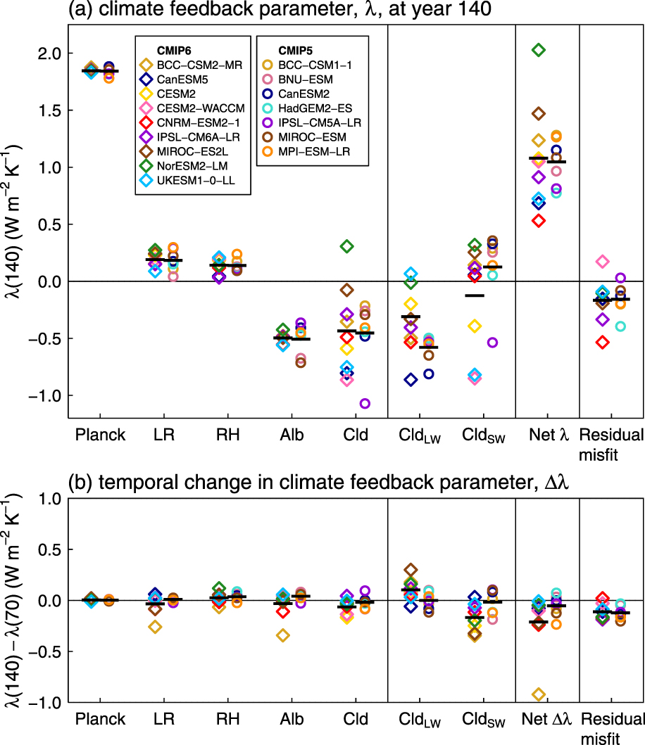Figure 9. (a) Climate feedback parameter λ, in W m−2 K−1, diagnosed using a regression over years 1 to 140 of the 1% annual increase in atmospheric CO2 simulations of 9 CMIP6 (diamonds) and 7 CMIP5 models (circles), decomposed into contributions from the Planck feedback, changes in the lapse rate (LR), relative humidity (RH), surface albedo (Alb) and clouds (Cld). The cloud term is further separated into longwave (LW) and shortwave (SW) contributions. The sum of the climate feedbacks is given by the net feedback (Net). The residual misfit is the difference between the net feedback and the sum of the kernel-decomposed feedbacks, reflecting inaccuracies in the kernel method. (b) Time evolution of λ, calculated as the difference between λ(140) and λ(70), where λ(70) is diagnosed using a regression over years 1 to 70 of the experiment and λ(140) over years 1 to 140. The sign convention is such that positive values for λ in (5) imply a negative physical feedback acting to oppose surface warming.