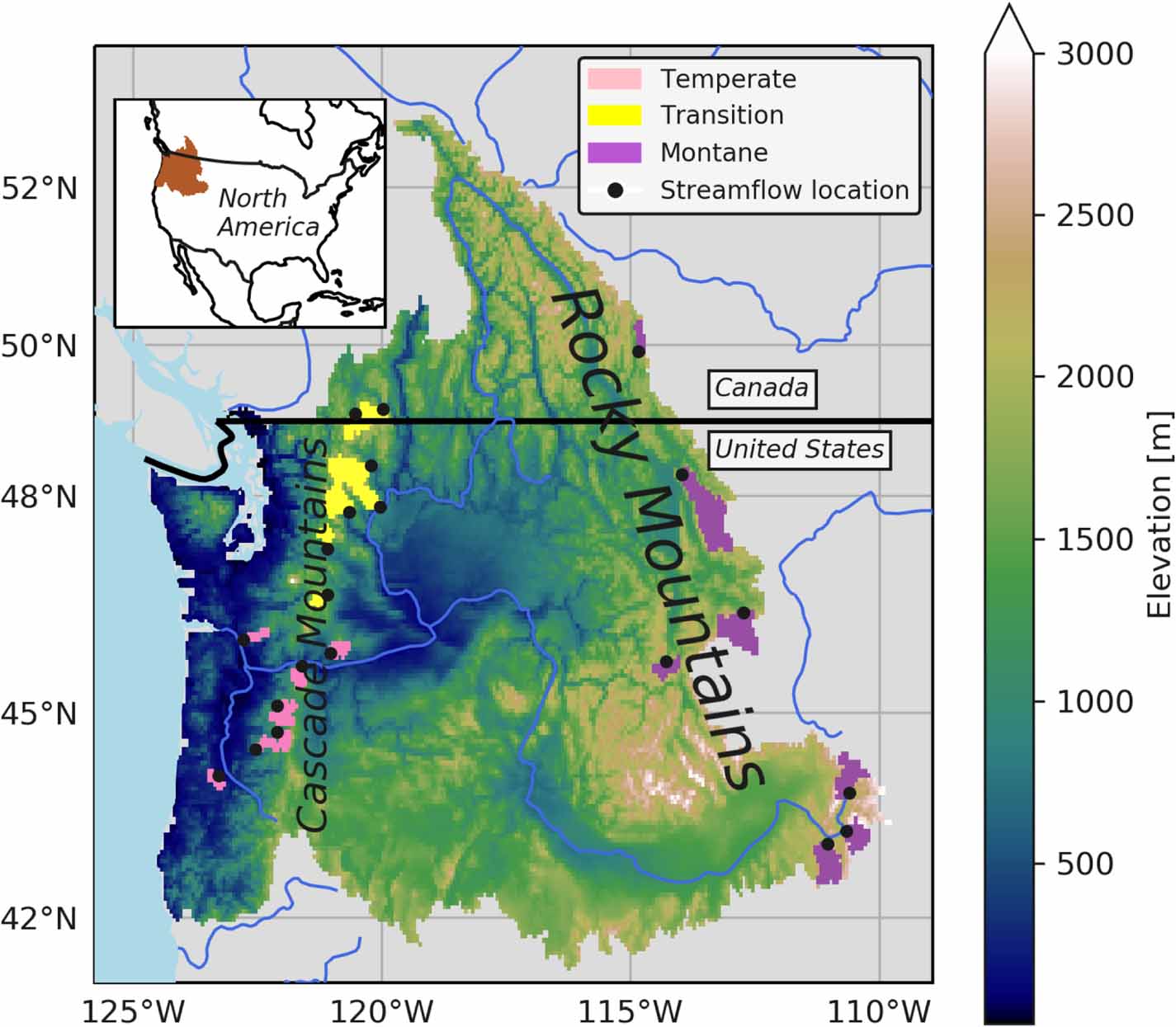 As a representative sample, we distributed the 21 headwaters basins among three different hydroclimatic regions: (1) temperate: seven basins in lowland, historically rain-dominant regions, (2) transition: seven basins on the leeward side of the Cascade Range, characterized as basins where precipitation is projected to transition from snow to rain under climate change, and (3) montane: seven high-elevation basins in the Rocky Mountains where snow is generally less at risk under a changing climate (Hamlet et al 2013, Chegwidden et al 2019).