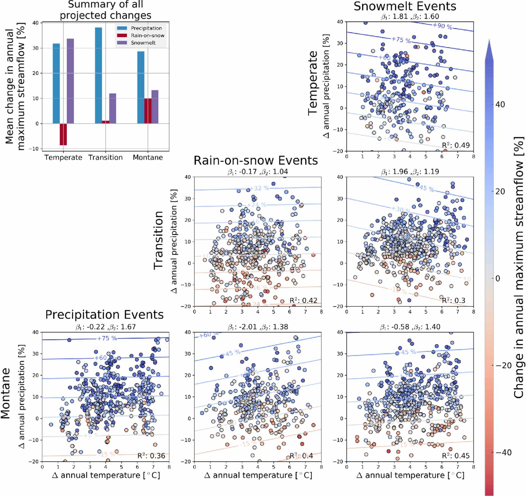 Figure 4. The dependence of changes in annual maximum daily flow on changes in mean annual temperature and precipitation between the control and future period. Columns show floods from different FGPs. Rows indicate different study regions. Every dot corresponds to a different climate forcing (RCP-GCM) permutation for a different streamflow basin. Isolines indicate a linear regression from equation (1) with coefficients for temperature (β1) and precipitation (β2) shown in plot titles. Plots only shown in which regressions had an R2 of greater than 0.3. The mean change of all region/FGP combinations is shown in the upper left bar chart.
