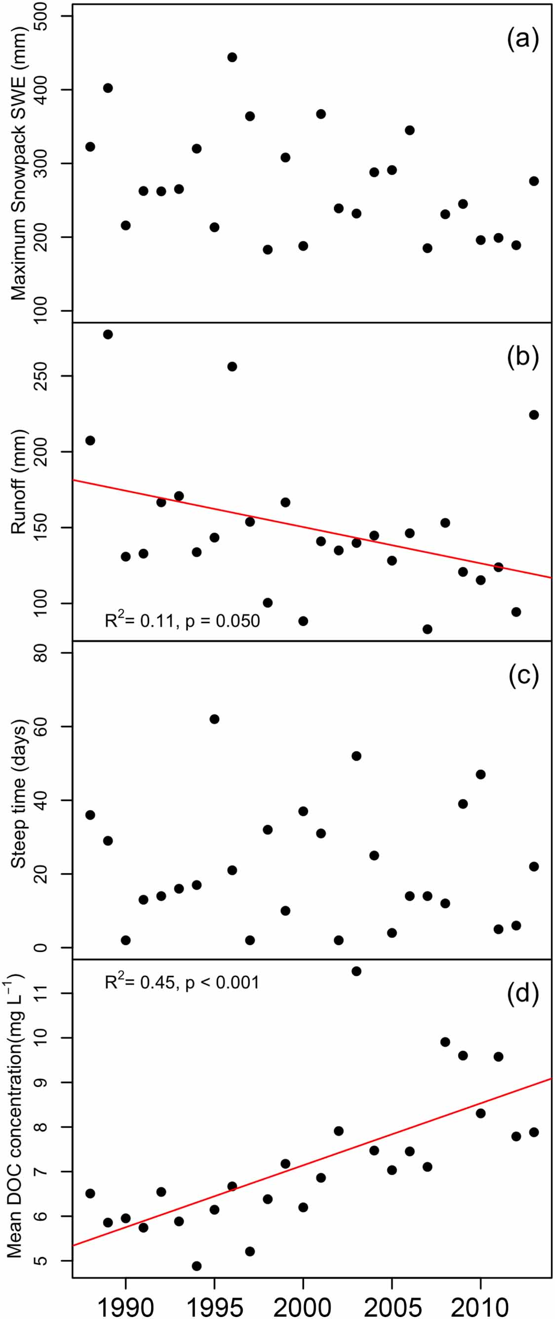 Figure 2. (a) Variation in snowpack maximum SWE has declined over the study period (Bartlett test; p = 0.023; n = 26 years). (b) There has been a marginal decline in annual runoff at Calumet Watershed over the last three decades. (c) Variation in spring melt duration (steep time) has declined over the study period (Bartlett test; p = 0.033). (d) DOC concentrations have been increasing at Calumet when plotted continuously and as yearly means (slope = 0.14 mg C l−1 Y−1).