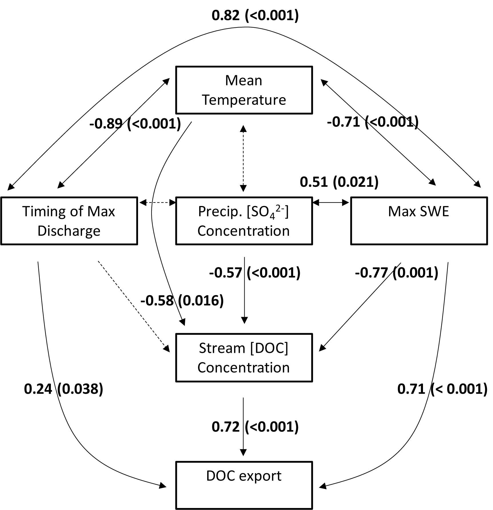 Standard image High-resolution imageFigure 3. A path analysis used to test the effects of snowmelt dynamics, climate and atmospheric deposition on DOC concentrations and export (depicted here are direct effects). Bold text indicates significant effects (p value in parentheses; dashed lines are non-significant paths). Model Standardized Root Mean Square Residual (SRMR) = 0.004; Bentler Comparative Fit Index (CFI) = 0.994.