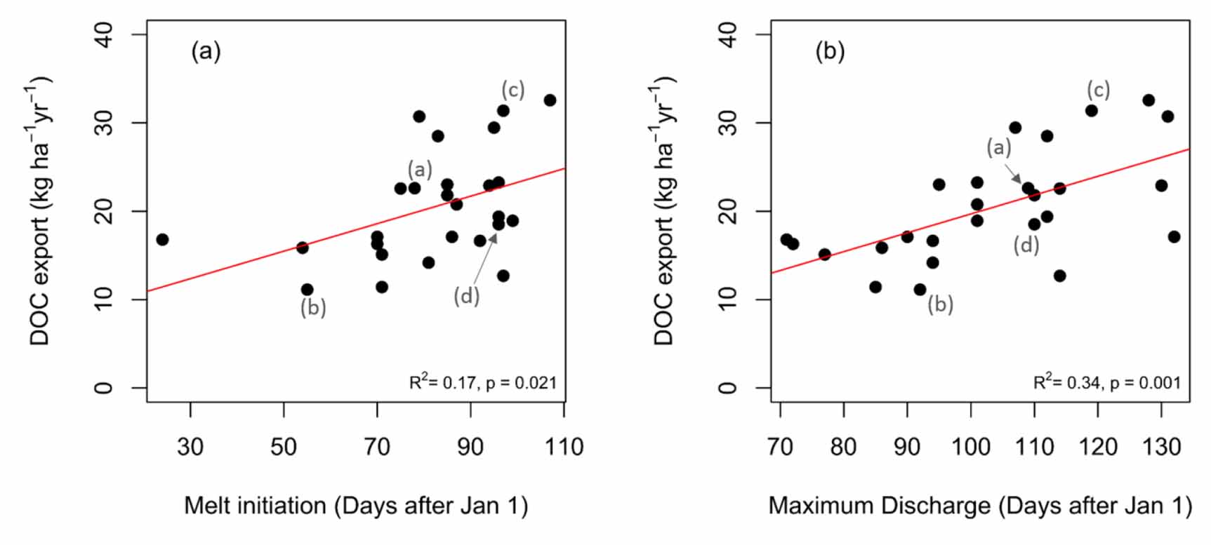 Standard image High-resolution imageFigure 5. (a) Later onset of melt, a scenario which is predicted to occur less often in the future, has correlated with a greater export of carbon from Calumet Watershed. (b) The timing of maximum discharge is also correlated with DOC export, with later peak discharge resulting in greater carbon export (cf .figure 3). Grey letters correspond to representative water years in figure 1.