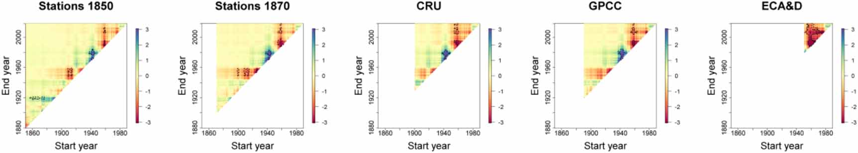 Figure 2. Heat maps of running trends in regional annual precipitation series from the different datasets, considering different periods with a minimum of 30 years. X and Y-axes indicate the start and end years of the time slices, respectively. The scale indicates the magnitude of the trend (mm/year) based on the slope of the linear regression analysis. Dotted lines indicate periods with a significant trend (p < 0.05).