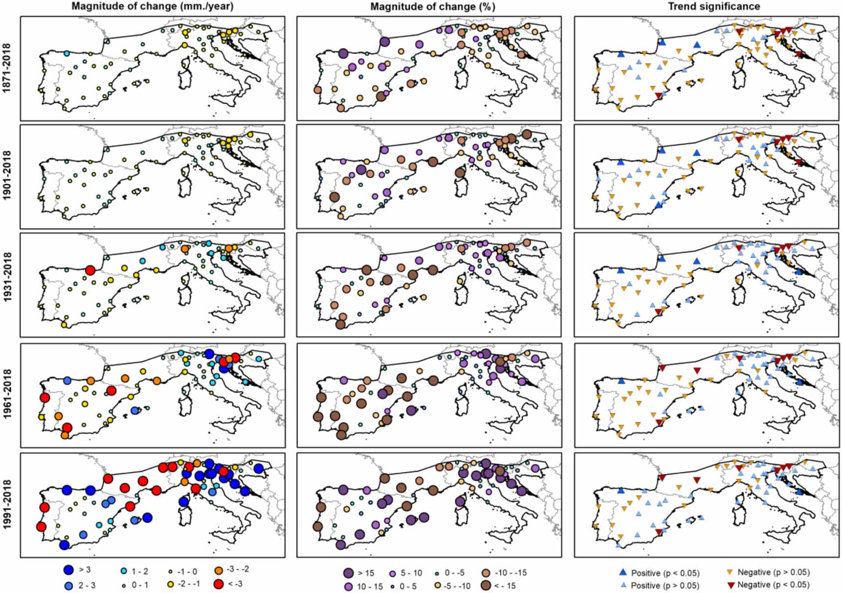 To assess the magnitude of change in seasonal and annual precipitation, we applied a linear regression model. The slope of the regression between the series of time (independent variable) and precipitation (dependent variable) indicated the amount of change (mm/year), with higher slope values suggesting greater change and vice versa. Seasons were defined as: winter (DJF), spring (MAM), summer (JJA) and autumn (SON). The statistical significance of trends was assessed using the non-parametric Mann-Kendall statistic, which measures the degree to which a trend is consistently increasing or decreasing. Statistical significance was tested at the 95% level (p < 0.05). The Mann–Kendall statistic is advantageous compared to parametric tests, as it is robust to outliers and does not assume any underlying probability distribution of the data. A modified version of the Mann–Kendall statistic was also applied to account for the possible effect of autocorrelation, which might be present in the series and could affect the significance of the trends (Hamed and Ramachandra Rao 1998). This statistic returns the corrected p values after accounting for the temporal pseudo-replication. In addition to this classical approach to trend detection, we also computed the amount of change in precipitation using the relative amount of change (%) rather than the absolute amount (mm). This approach allows for spatial comparability between different stations and gridded points. Maps of trend results were produced for the relative amount of change (%), using a linear regression model that considers the start and the end years of the study period. Finally, since the amount of change and statistical significance of the defined trends are sensitive to the selection of the study period (Hannaford et al 2013), we analysed trends for all possible temporal combinations, with a minimum period of 30 years in length between the start and end years of the study period (1851–2018). The results were illustrated by means of heat maps, where the magnitude of change in mm/year and the trend significance are shown.