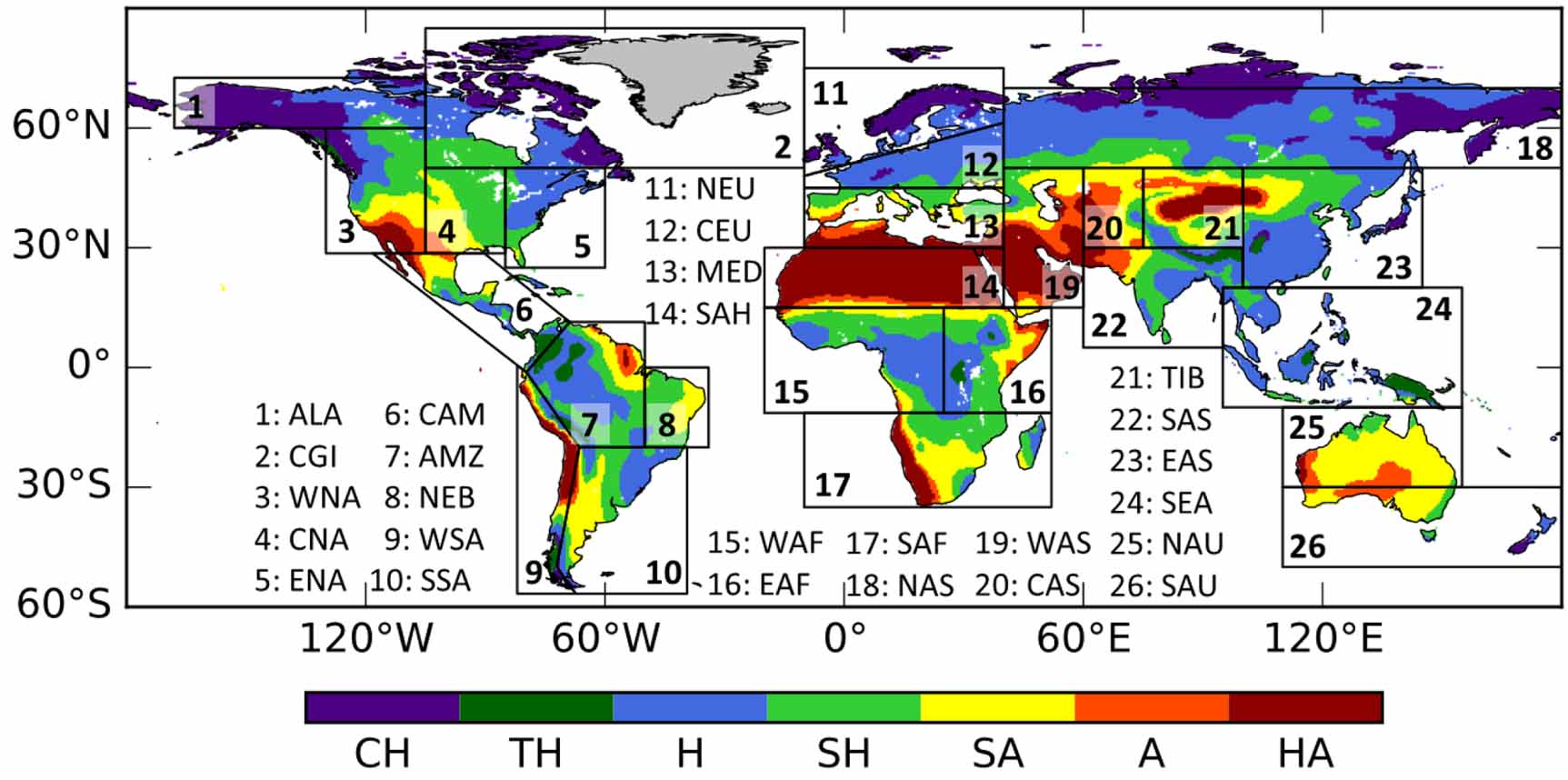 ). Boxes indicate IPCC AR5 reference regions called 26 SREX regions (IPCC, 2017).