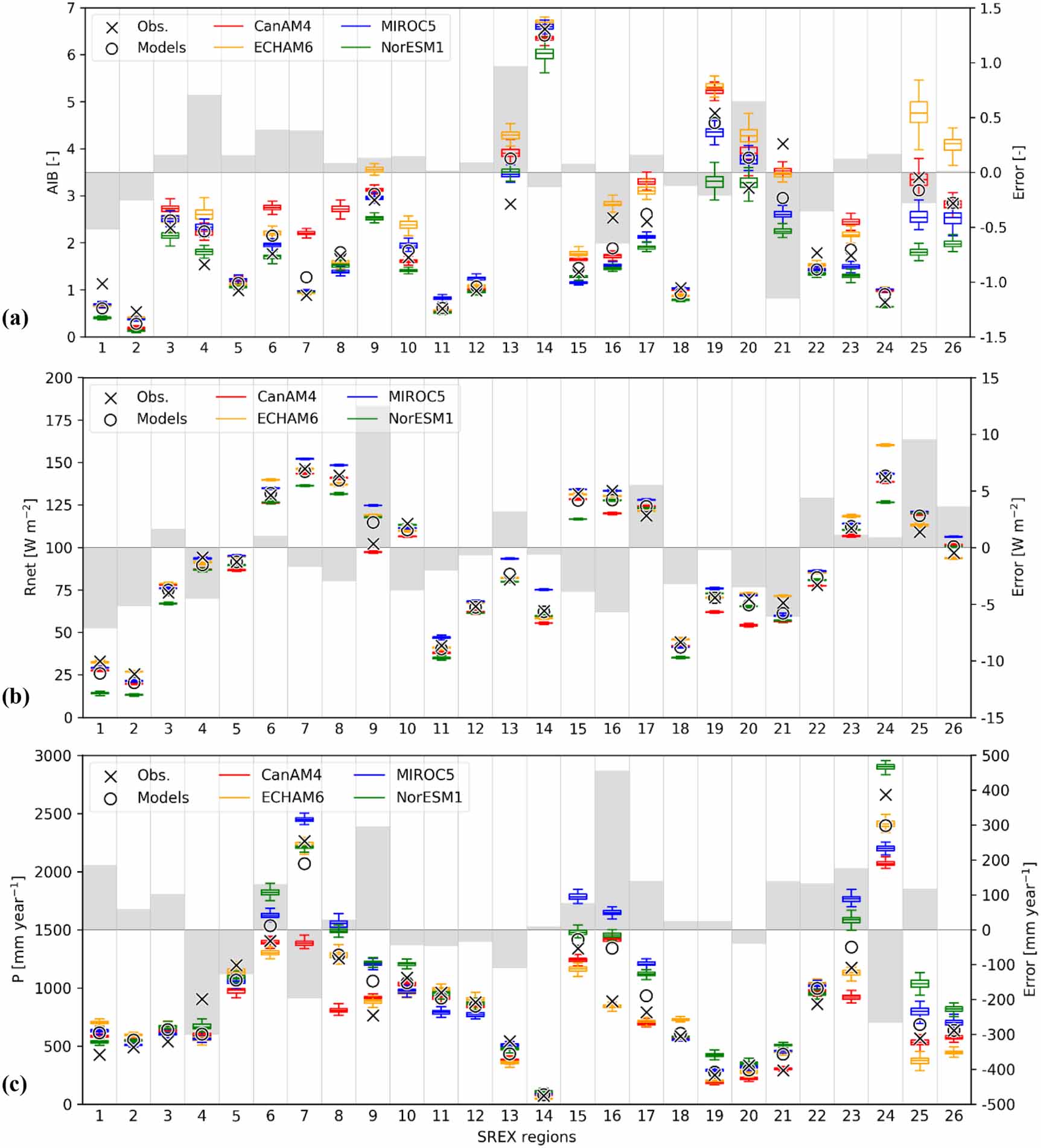 Figure 2. Regional means of decadal-mean annual precipitation from 2006 to 2015 in 26 SREX regions. 'x' marks in (a), (b) and (c) indicate observation of aridity index, precipitation (GPCP) and net radiation (CERES), respectively, and 'o' marks show those of model means. Gray bars indicate absolute errors (right y-axis) of ensemble model means against observations. Box plots show model experiments, CanAM4 (red), ECHAM6 (orange), MIROC5 (blue) and NorESM1 (green), and each model have 100 ensemble members of decadal means. Bars in the boxes show the model average, and the bottom and the top of the box corresponds to the 1st and the 3rd quantiles, respectively. The lower and upper whiskers show the smallest and the largest members in the range of