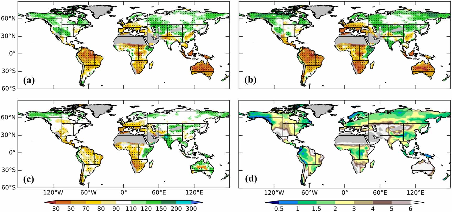 Our results also demonstrate that all four models simulate a drier planet under both P15 and P20 ― the aridity index increases by 2% to more than 8%, and extreme dry-year becomes 2–3 times more likely to happen ― over the Mediterranean, large areas of Western Europe, northern South America and South Africa. Compared to a 1.5 °C of warming, a + 2 °C world will result in more frequent dry year and more severe aridification across much of the terrestrial world. Considering the potential impacts over those regions, this further supports the need to limit global warming to 1.5 °C.