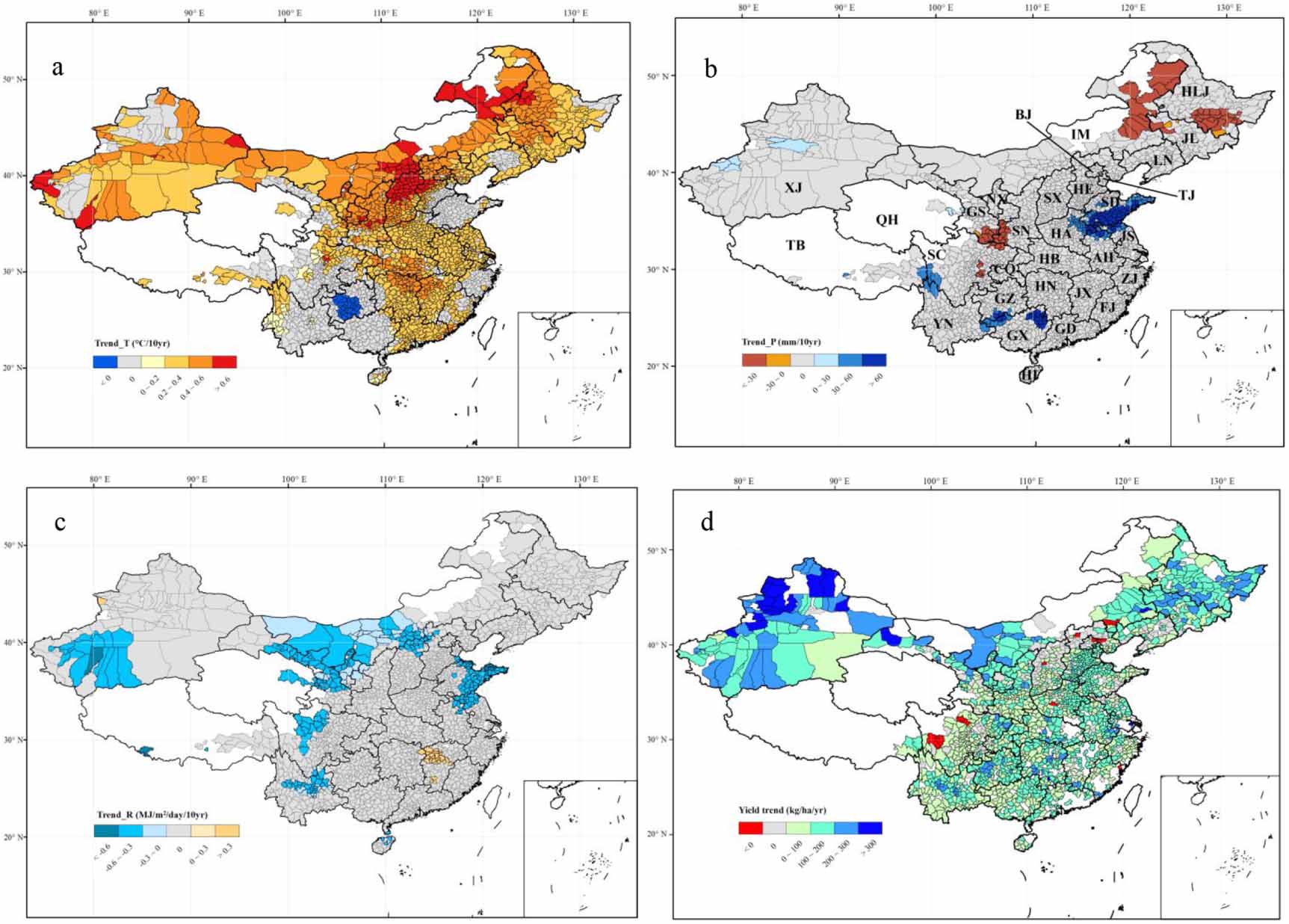 Figure 1. Trend in temperature (a), precipitation (b), solar radiation (c), and maize yield (d) of each county for the period 1980–2010. Colored areas represent different gradients of trends. Gray areas indicate counties without significant trends. Blank areas are counties without maize (a)–(c). For yield trends, we only showed the counties with more than 20 years of record (d). Abbreviation of Provinces: HLJ, Heilongjiang; JL, Jilin; LN, Liaoning; IM, Inner Mongolia; BJ, Beijing; TJ, Tianjin; HE, Hebei; HA, Henan; SD, Shandong; SX, Shanxi; SN, Shannxi; NX, Ningxia; GS, Gansu; QH, Qinghai; XJ, Xinjiang; HB, Hubei; HN, Hunan; AH, Anhui; JX, Jiangxi; JS, Jiangsu; ZJ, Zhejiang; FJ, Fujian; TB, Tibet; SC, Sichuan; CQ, Chongqing; GZ, Guizhou; YN, Yunnan; GX, Guangxi; GD, Guangdong; HI, Hainan.