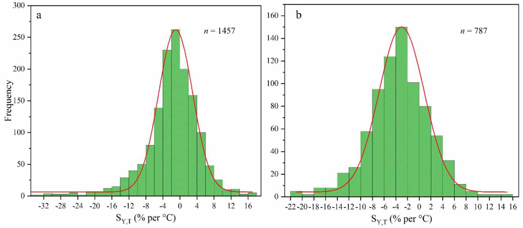 Figure 4. Frequency distributions of SY,T (% per °C) simulated by soil indigenous nutrients. (a) Spring maize planted in 1457 counties and (b) summer maize planted in 787 counties. The red line represents the frequency fitted by the amplitude version of the Gaussian peak function.