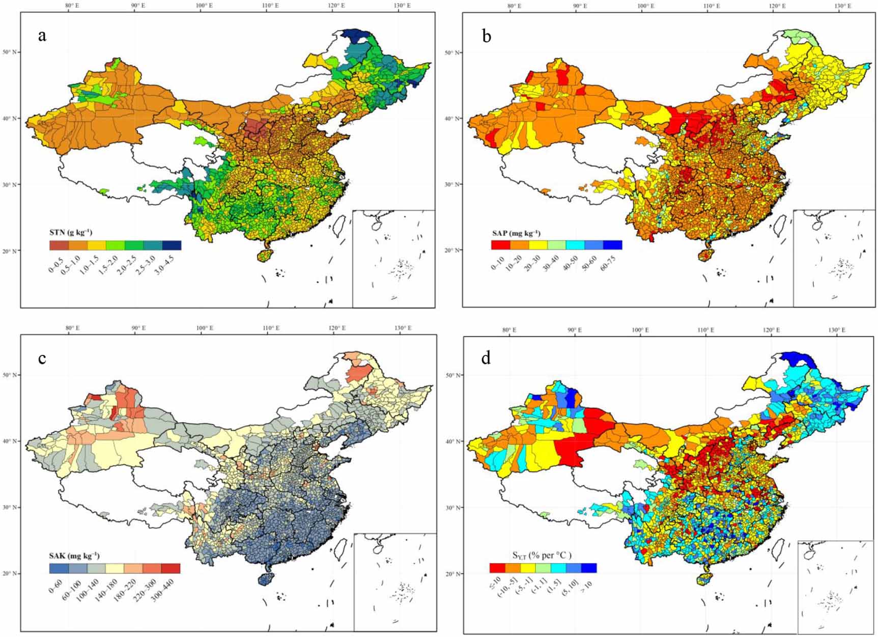Figure 5. Spatial distribution of soil indigenous nutrients and SY,T. Colored areas represent different gradients of STN (a), SAP (b), and SAK (c). Seven colors represent different effects of soil indigenous nutrients on SY,T (d), that is, SY,T ≤ − 10% per °C, extreme vulnerability; −10% per °C < SY,T ≤ −5% per °C, moderate vulnerability; −5% per °C < SY,T ≤ − 1% per °C, low vulnerability; −1% per °C < SY,T ≤ 1% per °C, marginal; 1% per °C < SY,T ≤ 5% per °C, low resilience; 5% per °C < SY,T ≤ 10% per °C, moderate resilience; SY,T > 10% per °C, high resilience.