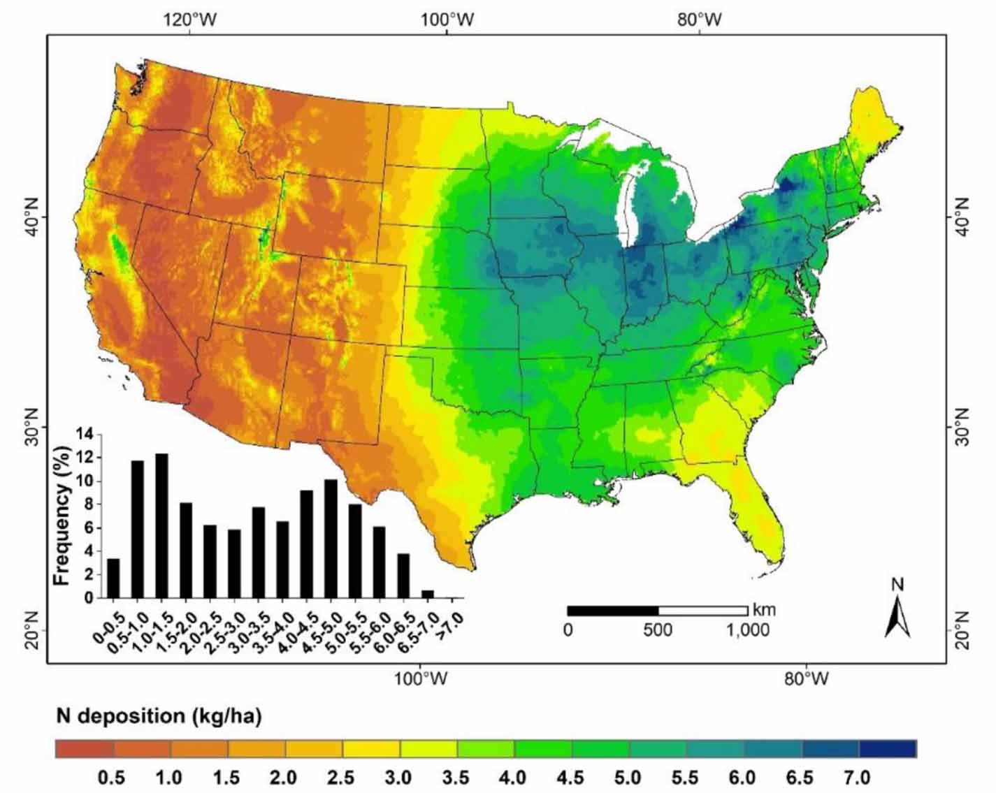 Figure 1. Spatial distribution of averaged nitrogen deposition in CONUS during the year 1986–2015.