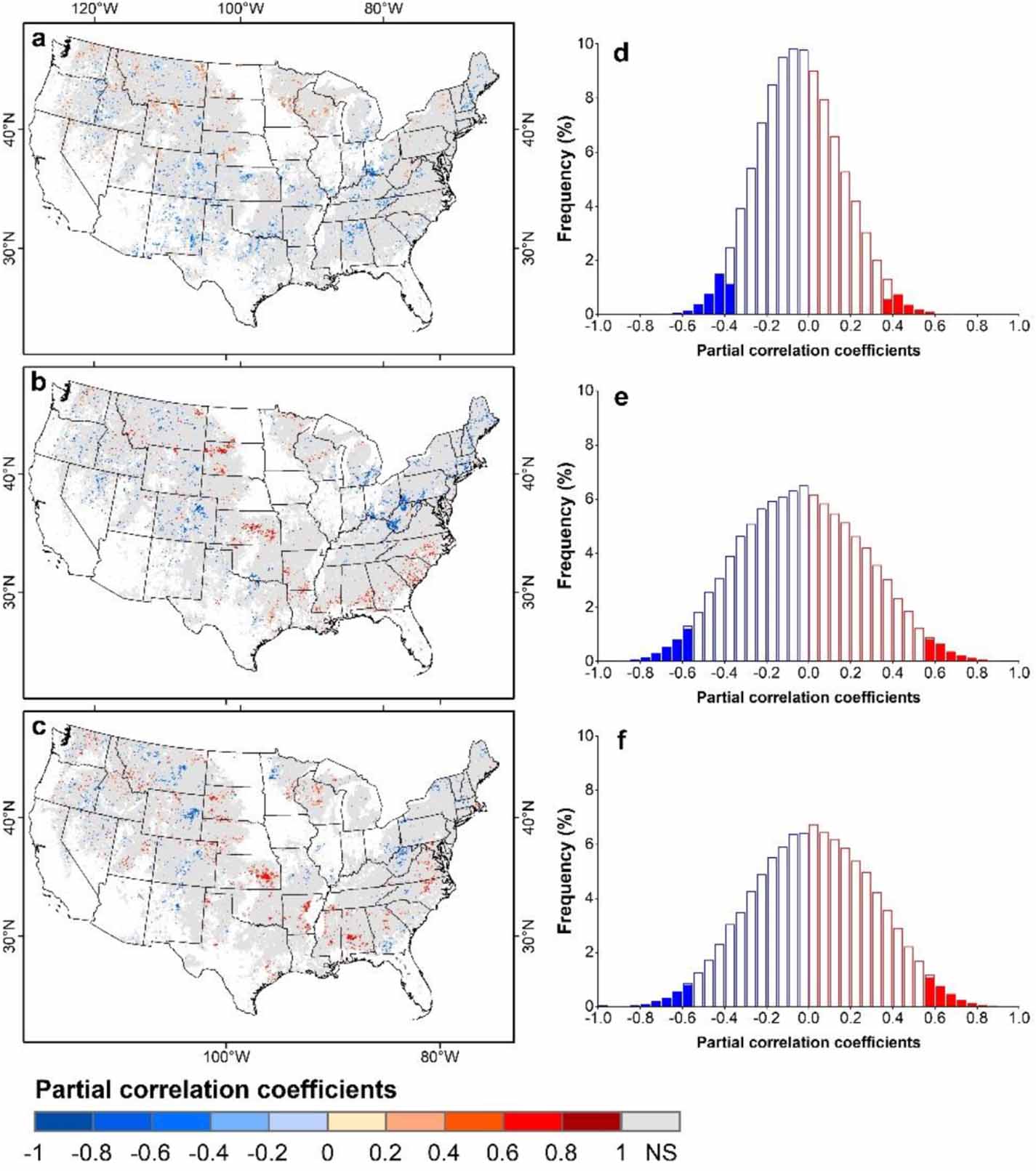 Figure 2. Spatial patterns of partial correlation coefficients between SOS and N deposition (a)–(c), and their corresponding frequency distributions (d)–(f). (a) and (d) represent the results from NDVI3g during 1986–2015. (b) and (e) are also from NDVI3g but during the periods 2001–2015. (c) and (f) represent the result from MODIS during 2001–2015. The gray pixels indicate correlations are not significant (p < 0.05). The red and blue bars in (d)–(f) represent positive and negative correlations, respectively, and the solid bars represent the significant (p < 0.05) correlations.