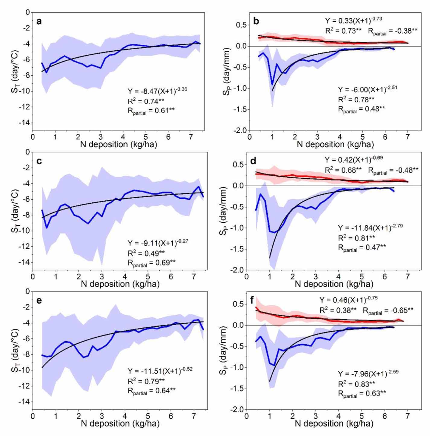 While investigating the impact of N deposition on SOS, we used a partial correlation analysis to remove the influence of climatic factors. We calculated the partial correlation coefficient between SOS and annual N deposition of the previous year by keeping the spring (March–May) mean temperature and total precipitation as the control variables.
