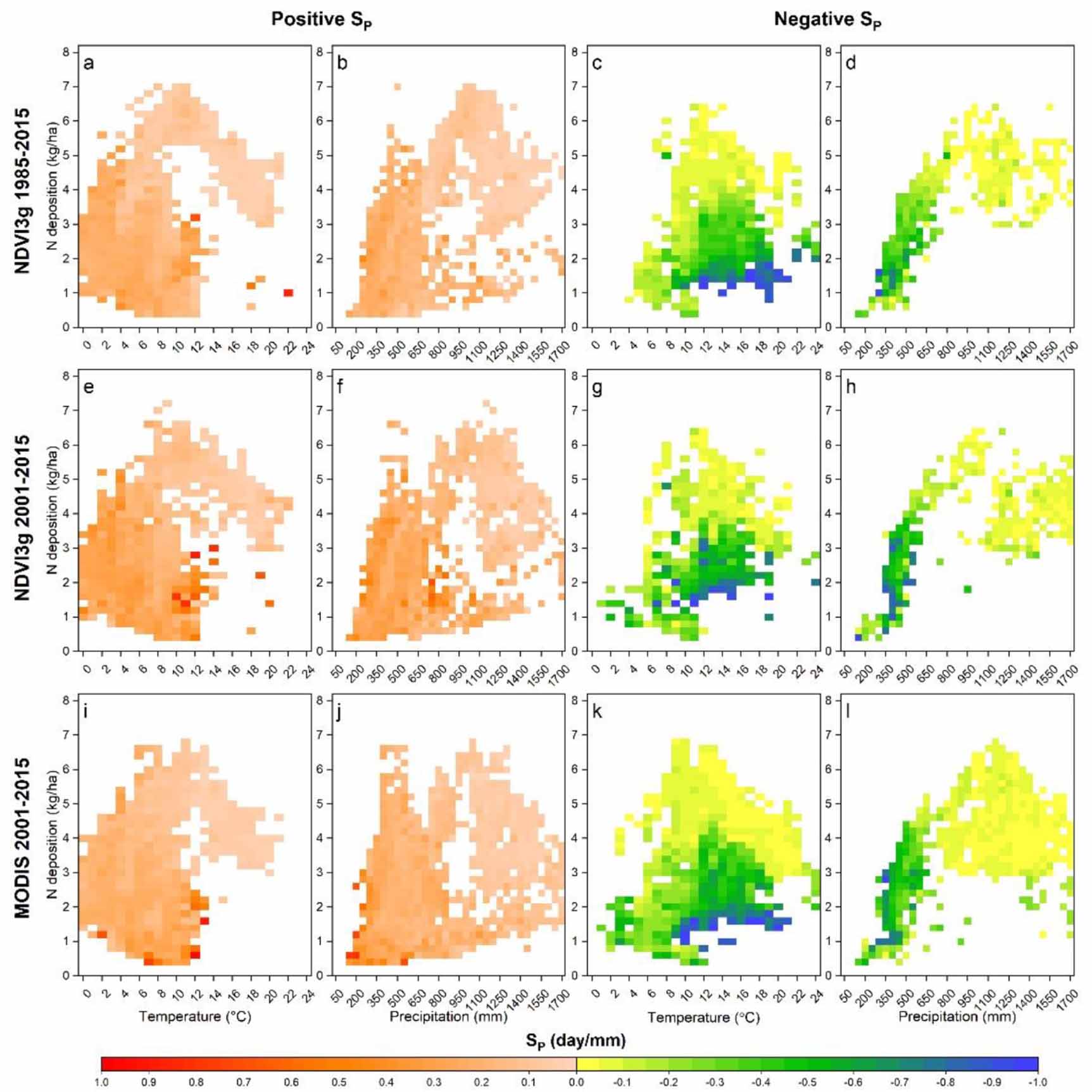 Standard image High-resolution imageThe distributions of SP in N deposition and climate space are shown in figure 7. From NDVI3g during 1986–2015, we found that both positive (figure 7(a)) and negative (figure 7(c)) SP decreased to near 0 d mm−1 with the increase in N deposition, but varied little among different temperature zones. This was further supported by the results from different datasets during 2001–2015 (figures 7(e), (g), (i), and (k)). However, both N deposition and precipitation could influence SP. SOS was more sensitive to precipitation in areas with N deposition lower than 2 kg ha−1 and annual precipitation less than 400 mm. With the increase in N deposition and precipitation, both positive (figures 7(b), (f), and (j)) and negative (figures7(d), (h), and (l)) SP significantly declined.