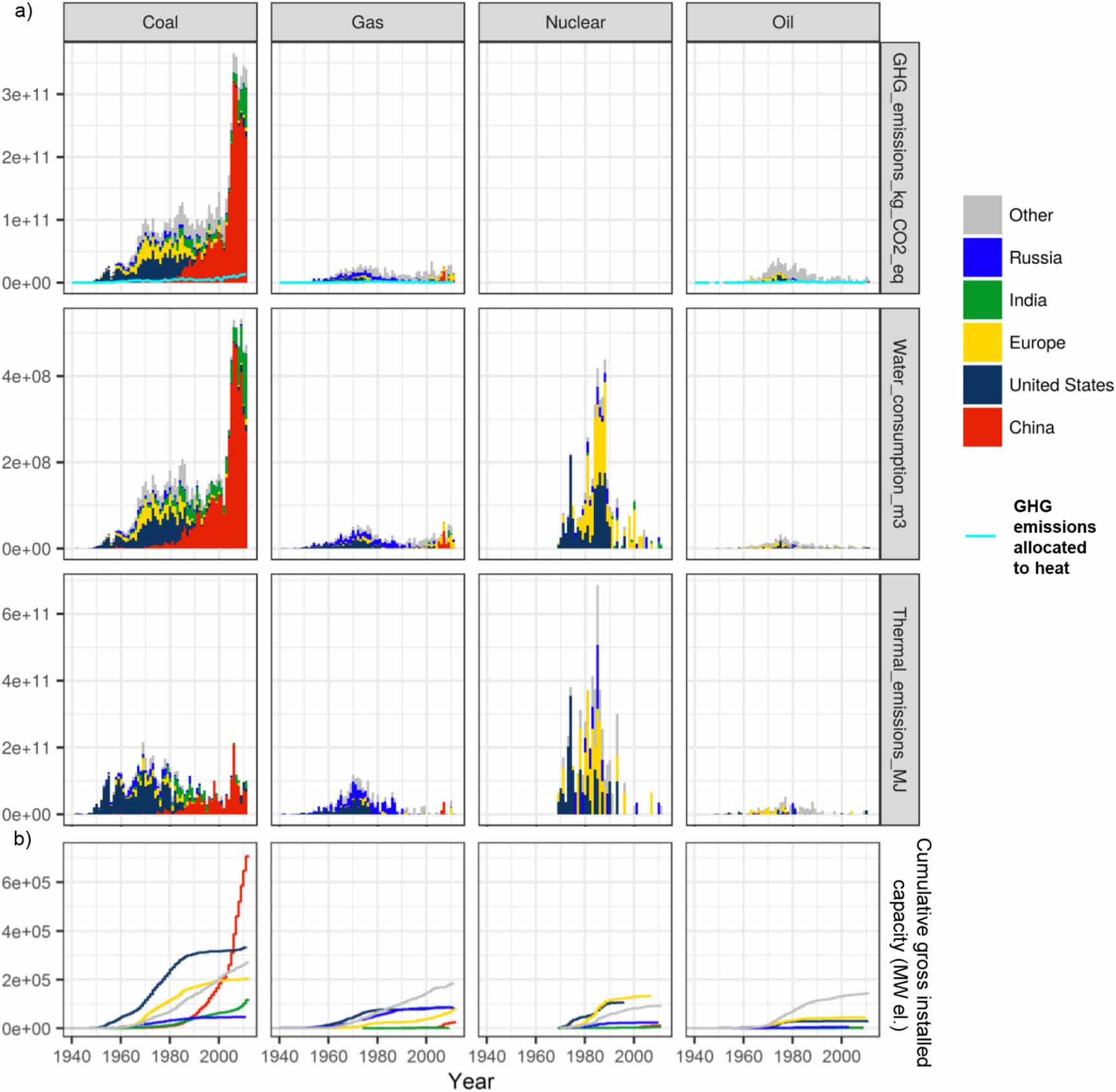 Figure 1. For the major fuel groups (accounting for 91% of the global steam-electric power generation) the per region: (a) distribution of total annual environmental stressors from electricity and heat generation, as a function of the year during which the responsible steam-electric power generating unit commenced operation. The turquoise line traces the contribution of GHG emissions allocated to heat production from cogenerative units. Aggregated and further disaggregated versions of this figure can be found in the SI (S12–S15). (b) The cumulative gross installed electricity generation capacity.