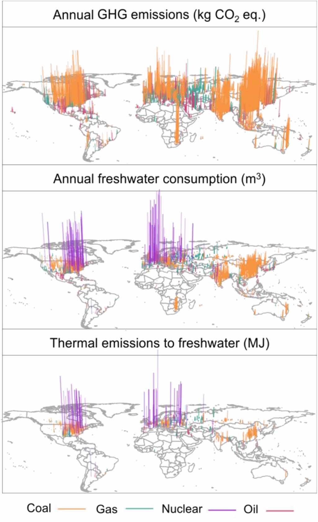 This work presents a comprehensive environmental burden analysis with an unprecedented combination of the highest level of detail and coverage of the global steam-electric power sector, offering the most detailed dataset to date relating to three important environmental stressors, GHG emissions, freshwater consumption, and thermal emissions to freshwater. According to the validation carried out (see SI), there is confidence in the stressor intensities, and accurate unit/power plant level absolute emission and consumption data can be calculated based on the former by acquiring generating unit/power plant level capacity factors—one of the easiest pieces of information to obtain from plant operators.