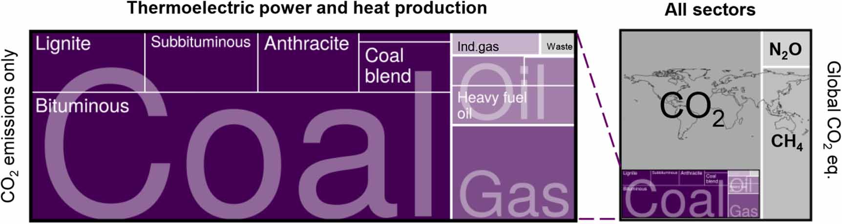Standard image High-resolution imageFigure 3. The global annual CO2 emissions from steam-electric power and heat production, as calculated in this work, put into perspective with the annual GHG emissions from the entire global economy, as estimated by the EDGAR database (19% of total) [39, 40]. The area of each tile is proportional to its value. The shares of CO2, N2O, and CH4 emissions from the entire public electricity and heat production sector in CO2 eq. (respectively 29%, 0.16%, and 0.02%) are visible in figure S17, a more detailed version of this figure.