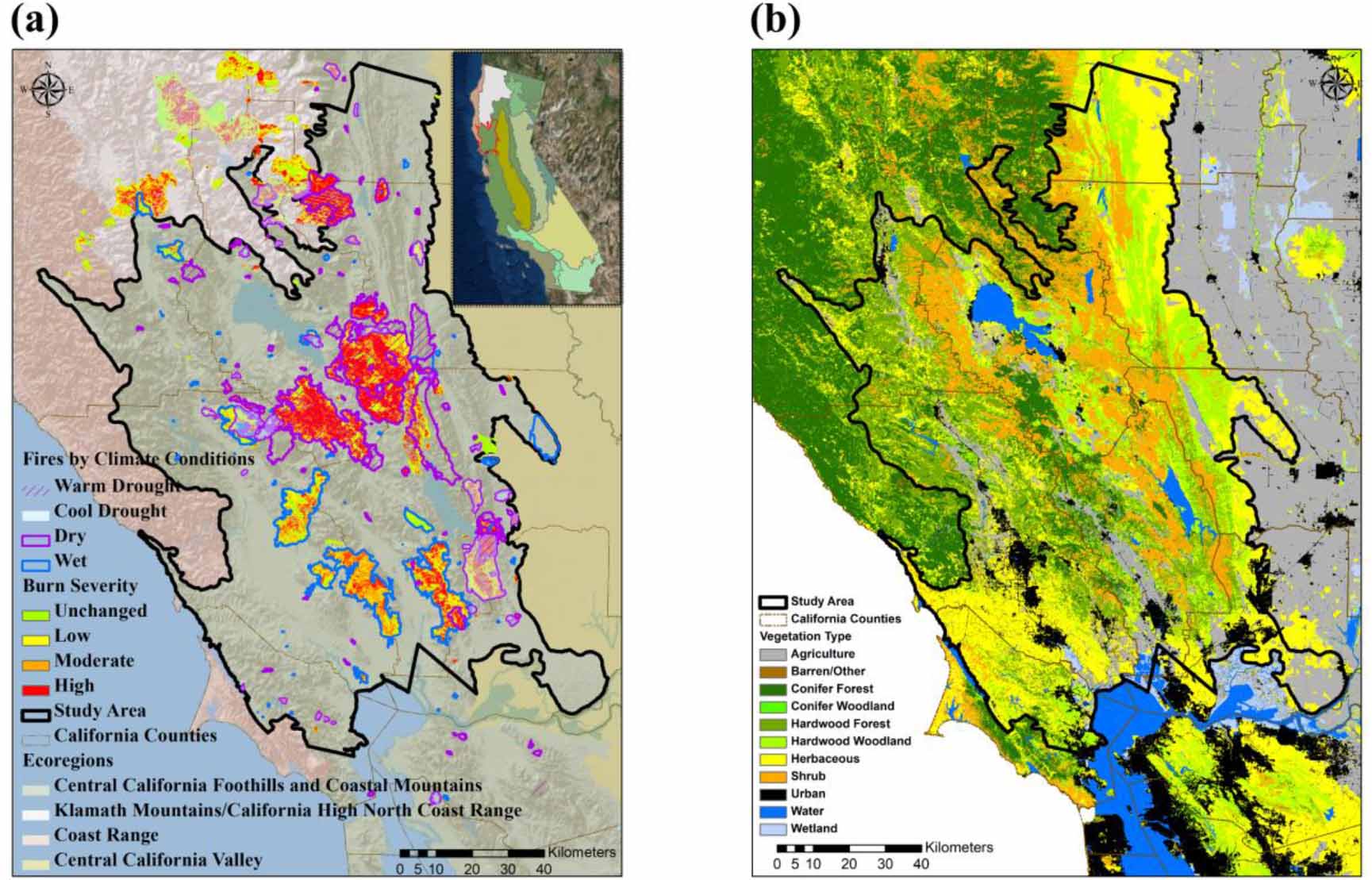Figure 1. Northern California Coastal Mountain study area (shown as black polygons): (a) Burn severity of 1984–2017 fires from Landsat; (b) Land cover map from FRAP 2015 vegetation type dataset. The inset in (a) shows the study area extent on top of the EPA level-3 ecoregion map. Also shown are the FRAP fire boundaries colored by four climatic conditions: fires during wet periods in blue and during dry periods in purple polygons, which were further divided into the cool drought in light blue and the warm drought in hashed polygons.