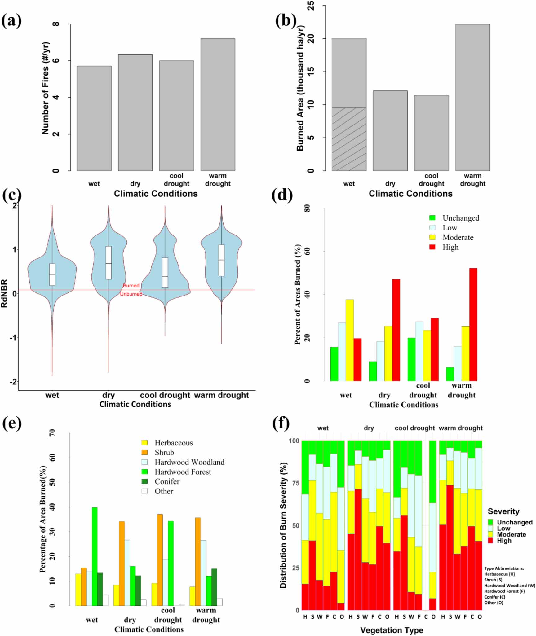 Figure 3. Fire characteristics under four climatic conditions during 1984–2017, including (a) mean annual number of fires, (b) areas burned, and burn severity as represented by (c) RdNBR and (d) distribution of categorical burn severity. Also shown are (e) distribution of vegetation type over areas burned and (f) distribution of burn severity categories within each vegetation type under the four climatic conditions. The hatched area in the bar for wet years in (b) represented the mean annual burned area excluding 2017, which was an extreme fire year. The outer shape of the violin plot in (c) represents the frequency of RdNBR values within burned areas, while the box plot within each violin represents the median, 1st and 3rd quantiles of RdNBR as well as upper and lower whiskers.