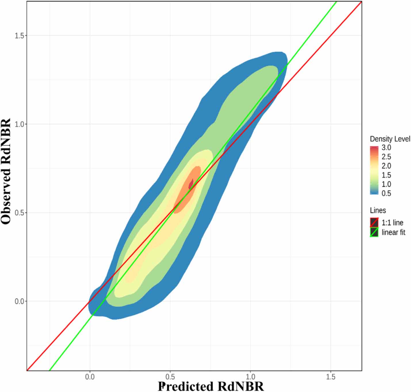 Figure 5. 2D density plot of the observed vs. predicted RdNBR for all burned pixels. The random forest regression model was based on all fire events. The red line represents 1:1 line. Density level was calculated via a multivariate kernel density estimation.