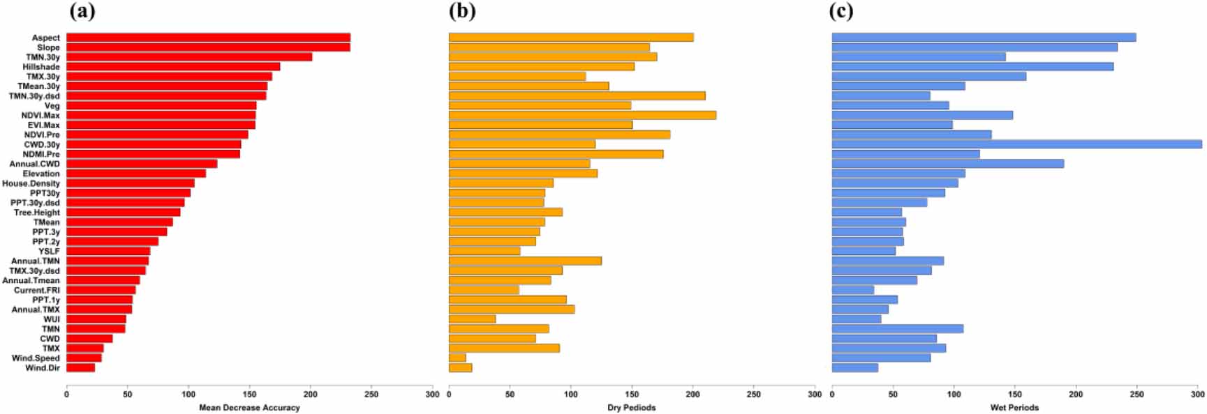 Figure 6. Variable importance of the RF classification models, (a) during all fire events, (b) during the dry conditions, and (c) during the wet conditions, respectively; Mean decrease accuracy for the classification models was based on the out-of-bag (OOB) samples, representing the amount of decrease in accuracy when removing the variable from a particular model. Variables were ranked according to the relative importance from the model based on all fire events.