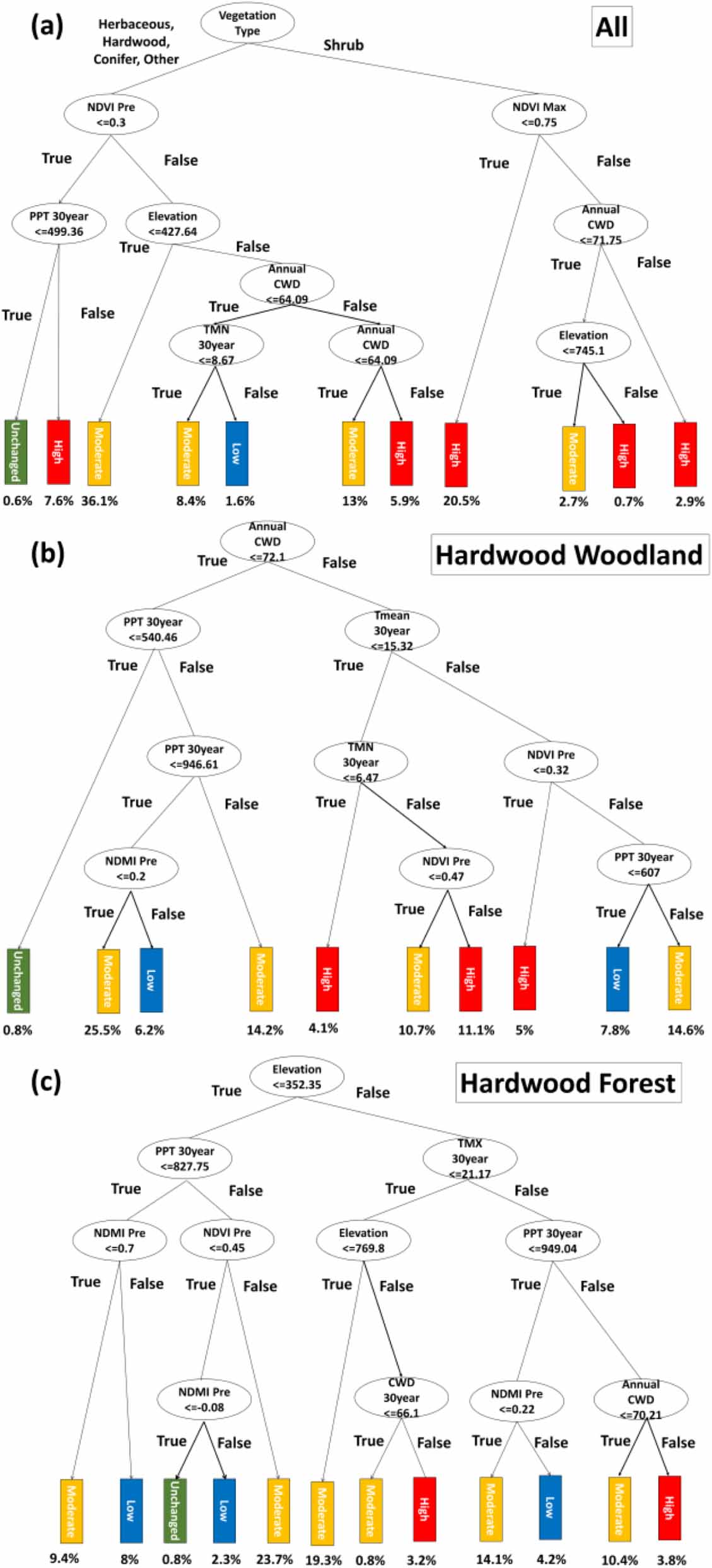 Figure 7. The surrogate classification trees for (a) all burned pixels during 1984–2017, and for (b) hardwood woodland and (c) hardwood forest, based on top 16 important variables from the random forest classification model. The final nodes were labeled by the dominant category. The percentage under each node shows the corresponding proportion of samples belonging to that node.