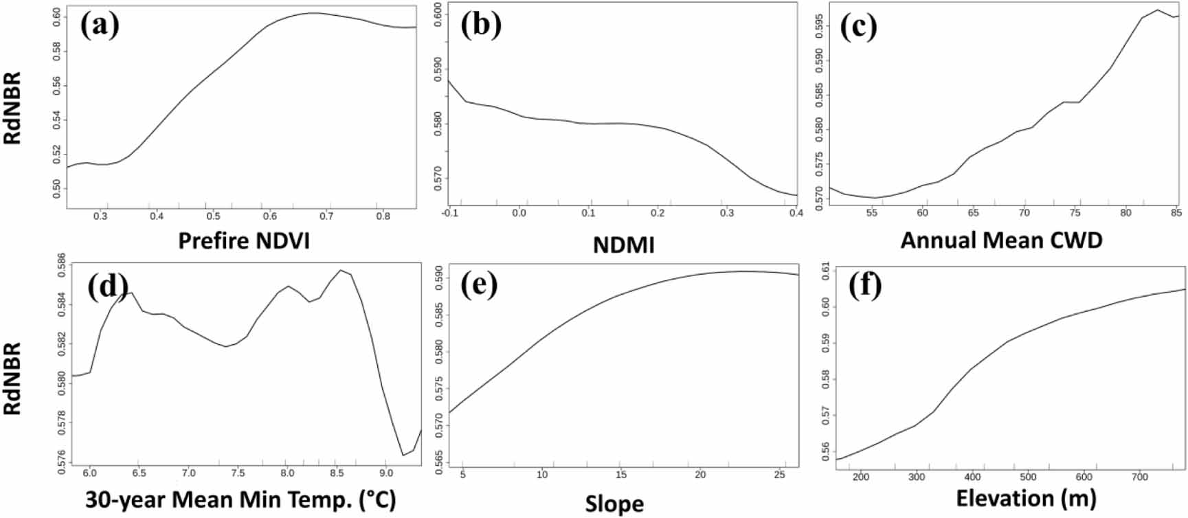 Figure 8. Partial dependence plots derived from the random forest regression model using all data points. We selected the most important variables from each group of environmental factors and showed the relationship between RdNBR and factors, including: (a) prefire NDVI, (b) NDMI, (c) mean CWD of the fire year, (d) 30 year average of minimum daily temperature, (e) slope and (f) elevation.