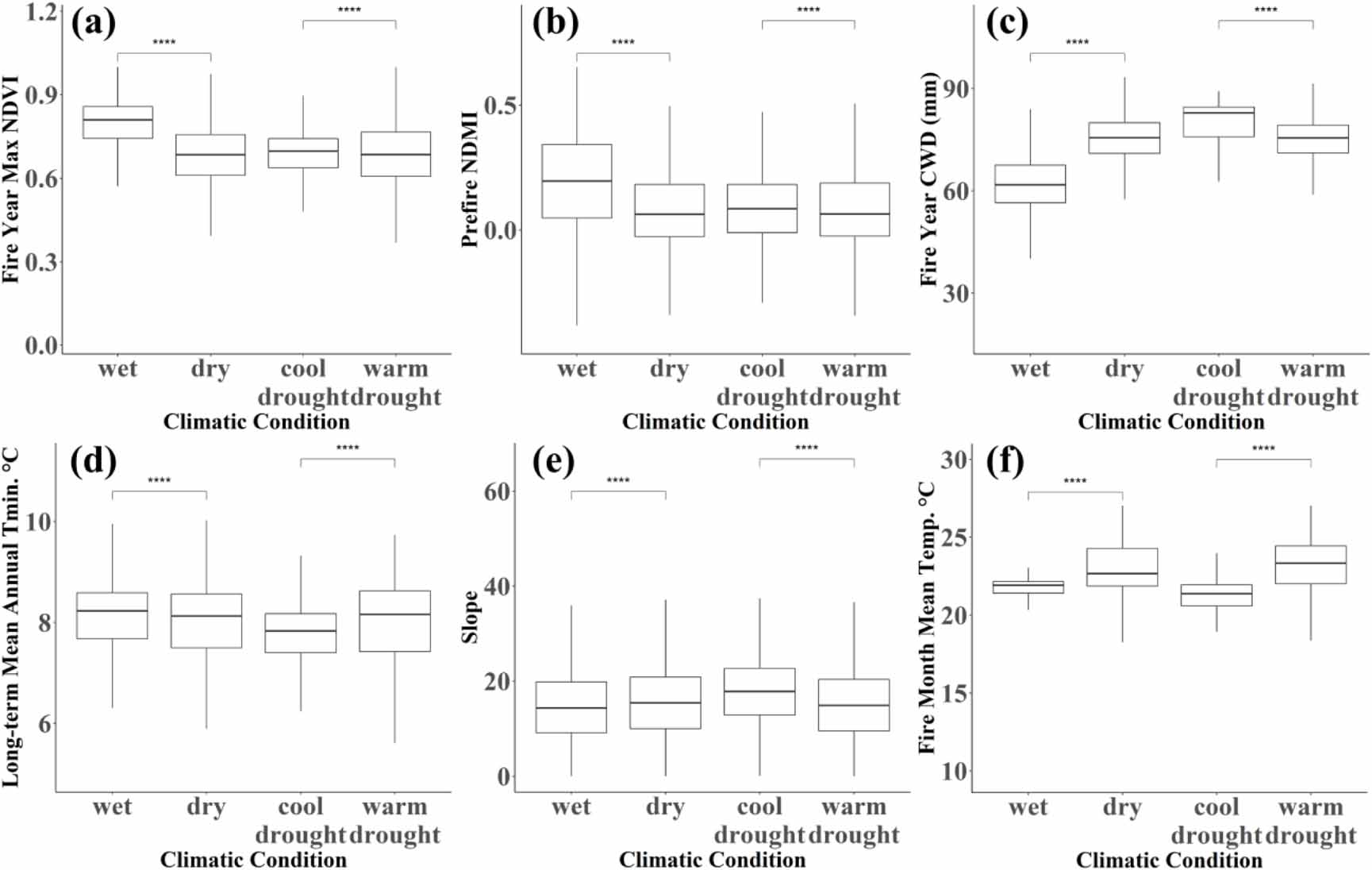 Figure 9. Differences of selected important drivers of burn severity under four climatic conditions, summarized over the burned areas, as shown by boxplots. The significance level of difference in drivers between two conditions from the Kruskal Wallis test is represented by (****) if the p-value is lower than 0.0001.