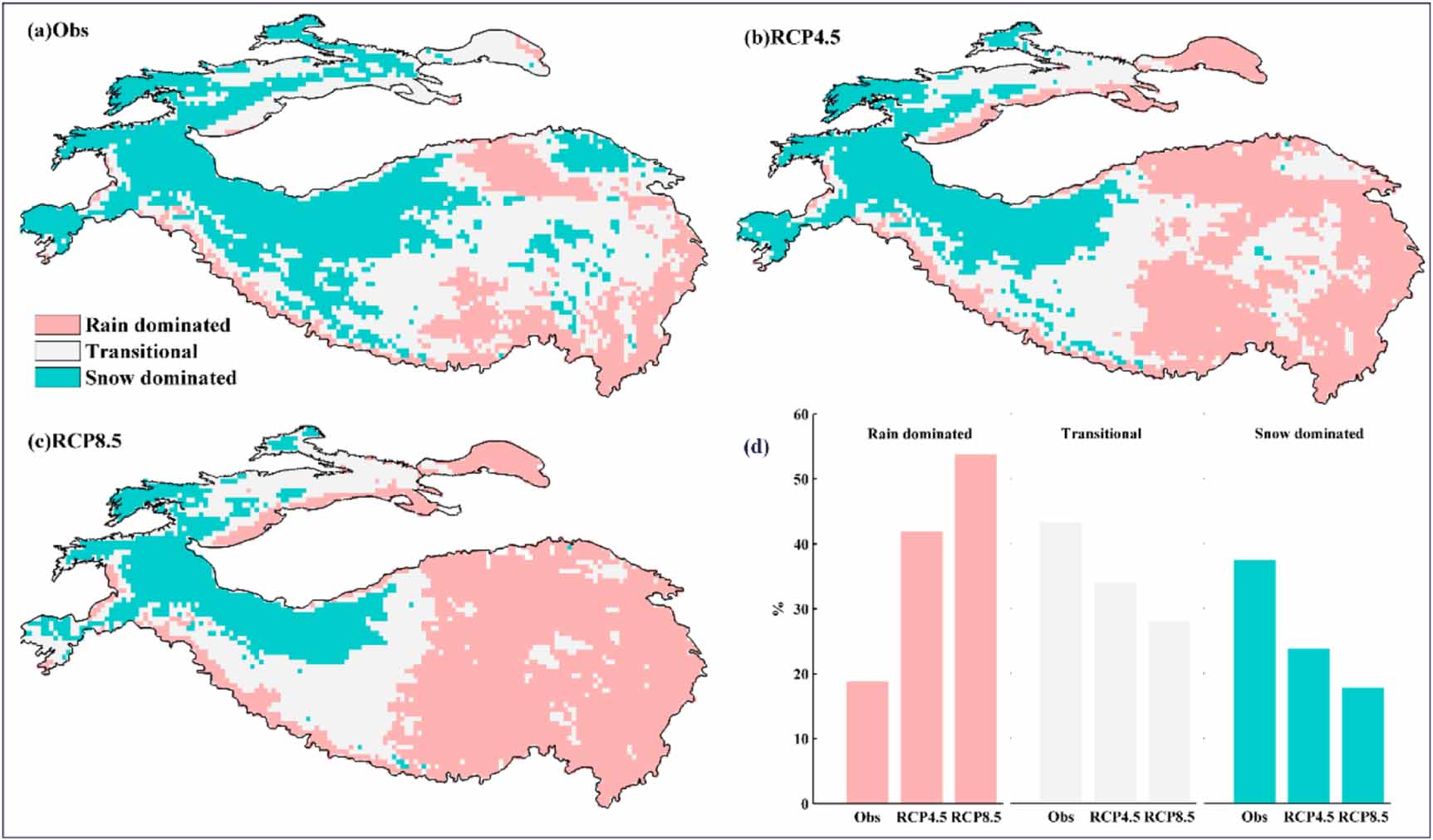 Figure 4. Distribution of rain-, transitional, and snow-dominated areas in HMA under historical (a) (1970–2005) and RCP4.5 (b) and RCP8.5 (c) (2070–2099) scenarios and their proportions (d) in each period.