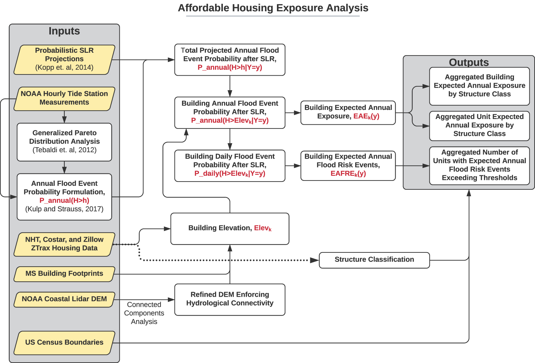To assess the exposure of affordable housing (and of general housing for comparison), we use the core methodology of Kulp and Strauss (2017), who defined expected annual exposure—the quantity of some variable (such as housing stock) expected to be exposed to at least one coastal flood-risk event in a given year.