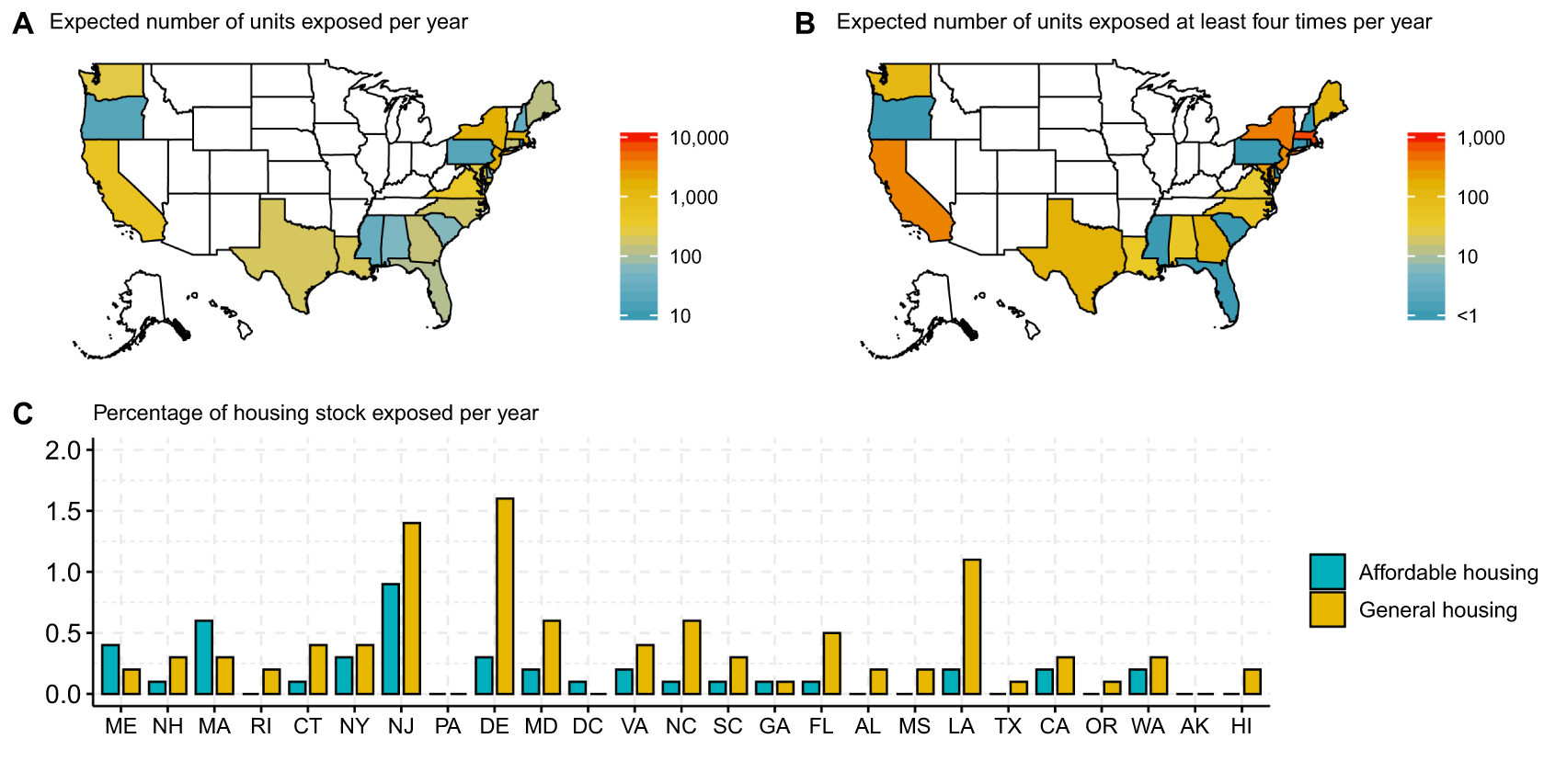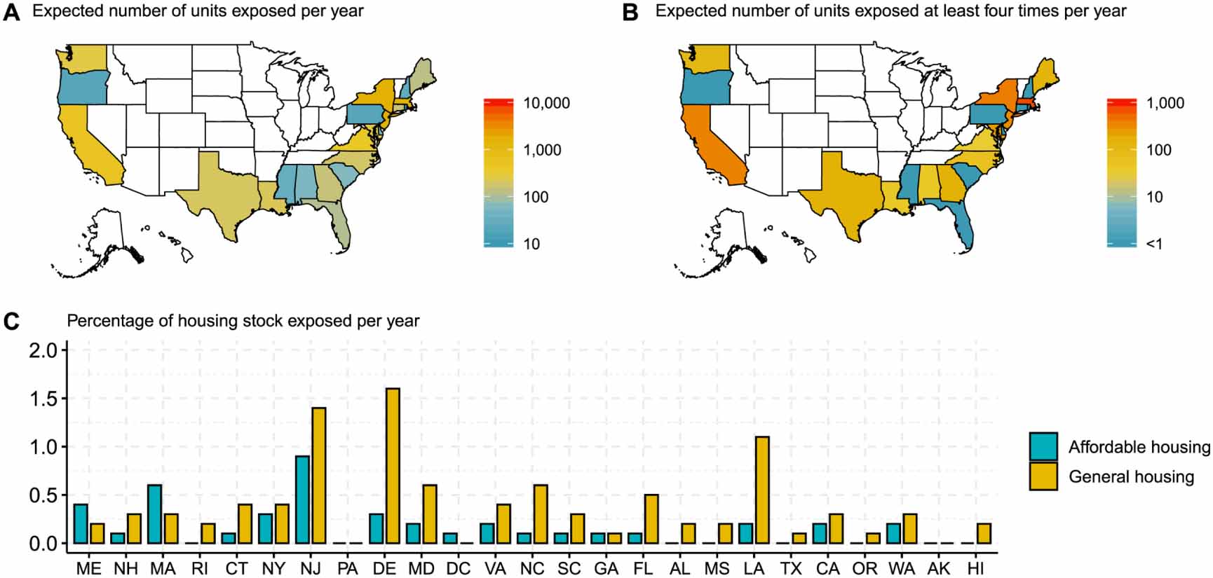 Figure 3. Recent threat of coastal flooding to states, based on mean sea levels for the year 2000 and integrating across local distributions of flooding. Panel A shows the total expected annual exposure of units (integrated across all units with nonzero exposure probability), while Panel B shows the expected number of units exposed at least four times per year. Panels A and B show values for the affordable (subsidized plus market-driven) housing stock. Panel C shows expected annual exposures as percentages of total affordable and general housing stocks. In Panel C, states are ordered geographically following coastlines from east to west.