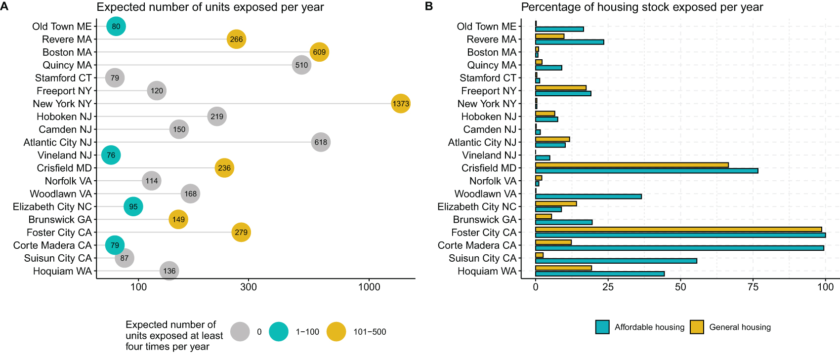 Table 3 shows the ranking of the top 20 cities in terms of annual number of units exposed by 2050. The top 20 cities account for 75% of the United State's aggregate expected annual exposure. These most vulnerable cities are highly concentrated along the northeastern corridor and in California. In some of these cities, with relatively smaller affordable housing stocks, over 90% of the stock is exposed (Crisfield, MD and Revere, MA).