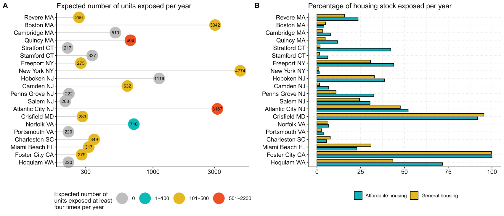 Figure 4. Recent threat of coastal flooding to the top 20 cities exposed (in absolute terms), based on mean sea levels for the year 2000 and integrating across local distributions of flooding. Panel A shows the total expected annual exposure of affordable housing units and the number of units expected to be exposed at least four times per year. Panel B shows expected annual exposures as percentages of total affordable and general housing stocks. Cities are ordered geographically following coastlines from east to west.