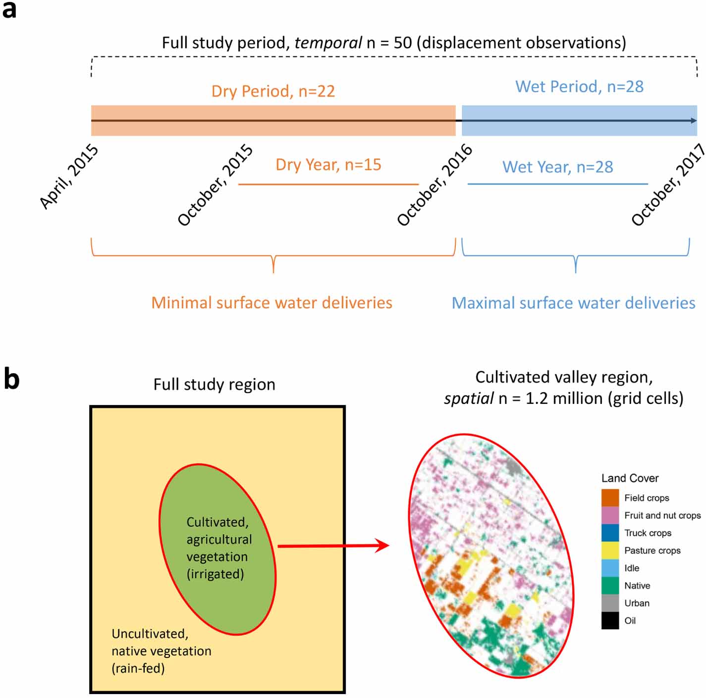 We performed analyses at the spatiotemporal resolution of the displacement data by using modal and median resampled values of land cover and water demand. Our analysis exploits variation across two dimensions. First, temporal differences between dry and wet time periods figure 2(a) represent extremes in surface water supply [36]. We defined the dry period to be April 1, 2015 - October 4, 2016 (22 observations) and the wet period to be October 5, 2016 - October 23, 2017 (28 observations). The dry period spans more than a single water year (October - September of either 2015-2016 or 2016-2017), due to our inclusion of additional April-September 2015 displacement observations to more closely balance the number of wet and dry period observations. Second, spatial differences between land cover types figure 2(b) represent differences in water demand. We split the study region into broad cultivated and uncultivated land regions using the extent of the cultivated alluvial valley [65] as a boundary (figures 1(a) and (b)), and 2(b). Where noted, we use either the full study region or the subset cultivated valley, as well as the land cover types therein.