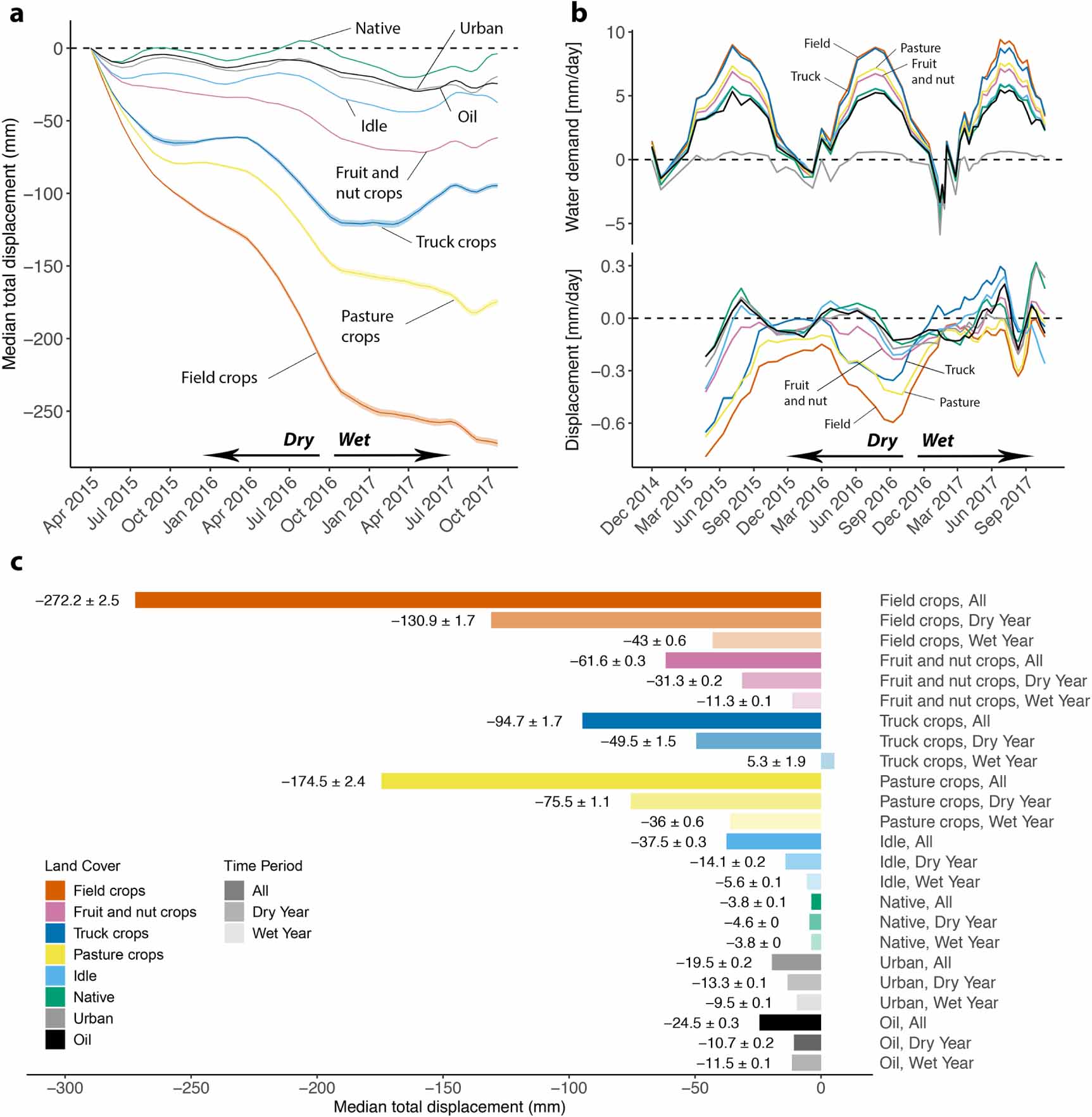 While agricultural land cover types are relatively well-mixed spatially across the larger study region, there exists some degree of spatial segmentation by land cover type, which motivated analysis within a subset area of the valley. For the subset analysis, displacement remains differentiated by land cover type, with field and pasture crop subsidence totals and rates exceeding those of fruit and nut and other non-agricultural land cover types (Supplementary figure S9 (b, c)). In our analysis accounting for spatial correlation in displacement, we replicated our main descriptive analyses using displacement data adjusted for spatial correlation, and also replicated our land cover type-level regression analysis through bootstrap sub-sampling of the study region. In both analyses, the relative relationships between displacement for different agricultural land cover types, and specifically negative displacement (subsidence) during dry months, were retained (Supplementary figures S10 and S11). When incorporating land cover classification error into the main descriptive analyses, the magnitudes of displacement for land cover types varied. However, the relative rankings of agricultural land cover types remained the same (Supplementary figure S2 and Supplementary table S3).