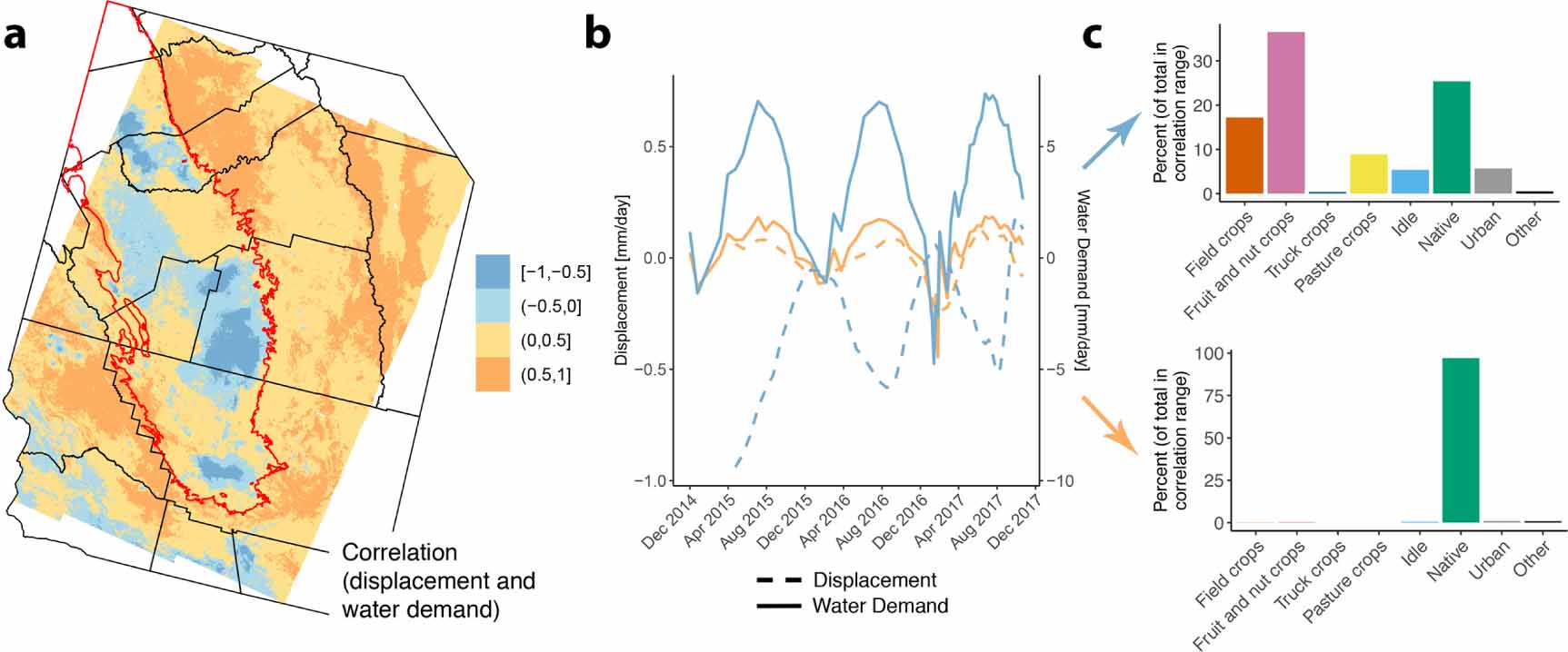 We explore the potential of InSAR to be used as a tool for agricultural groundwater monitoring and management at local scales. In the California Central Valley, despite abundant discussion and debate concerning the sustainability of the region's uniquely diverse specialty crop production [29–32], there exist no publicly accessible, fine-scale measurements of either surface water or groundwater withdrawals, rendering direct attribution of subsidence to water use difficult. Similarly, while land subsidence over large spatial scales has long been linked to groundwater pumping to meet agricultural water demand in the region [3, 23, 33, 34], to date it has not been possible to infer the intensity of local groundwater use from surface displacement, and it remains challenging to relate local subsidence to agricultural irrigation [21]. Here we combine new, high-resolution observations of vertical land surface displacement derived from InSAR [35] with climate and land cover data to attribute—at fine scale and for the first time—different rates and patterns of land surface displacement in the San Joaquin Valley to the differential groundwater demand generated by different land uses and associated irrigation.