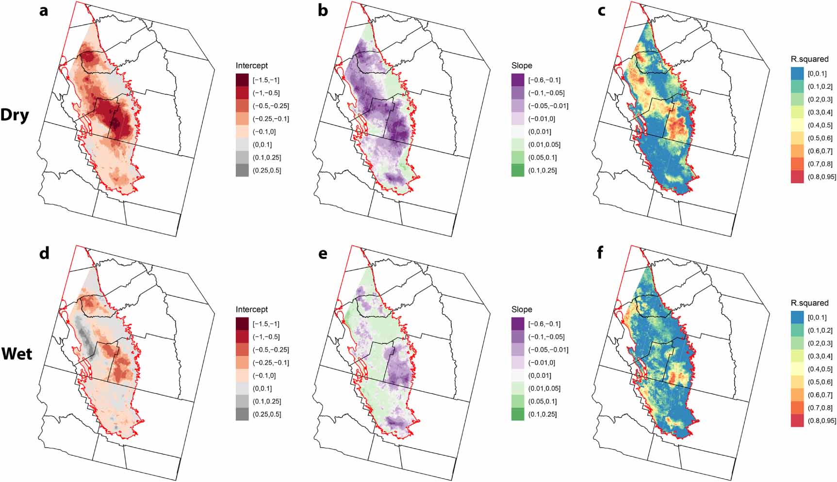 Figure 5. Spatial structure in the relationship between displacement and water demand. Maps show estimates from simple ordinary least squares regression of displacement rates on water demand rates at the grid cell-level in the cultivated valley (within the red lines), using observations within dry (April 1, 2015 - October 4, 2016, n = 22 per cell, a–c) and wet (October 5, 2016 - October 23, 2017, n = 28 per cell, d–f) time periods. (a, d) The intercept, or average displacement rate; (b, e) the slope, or average change in the displacement rate with a unit increase in the water demand rate; (c, f) the R-squared, or the fraction of variation in displacement explained by water demand.